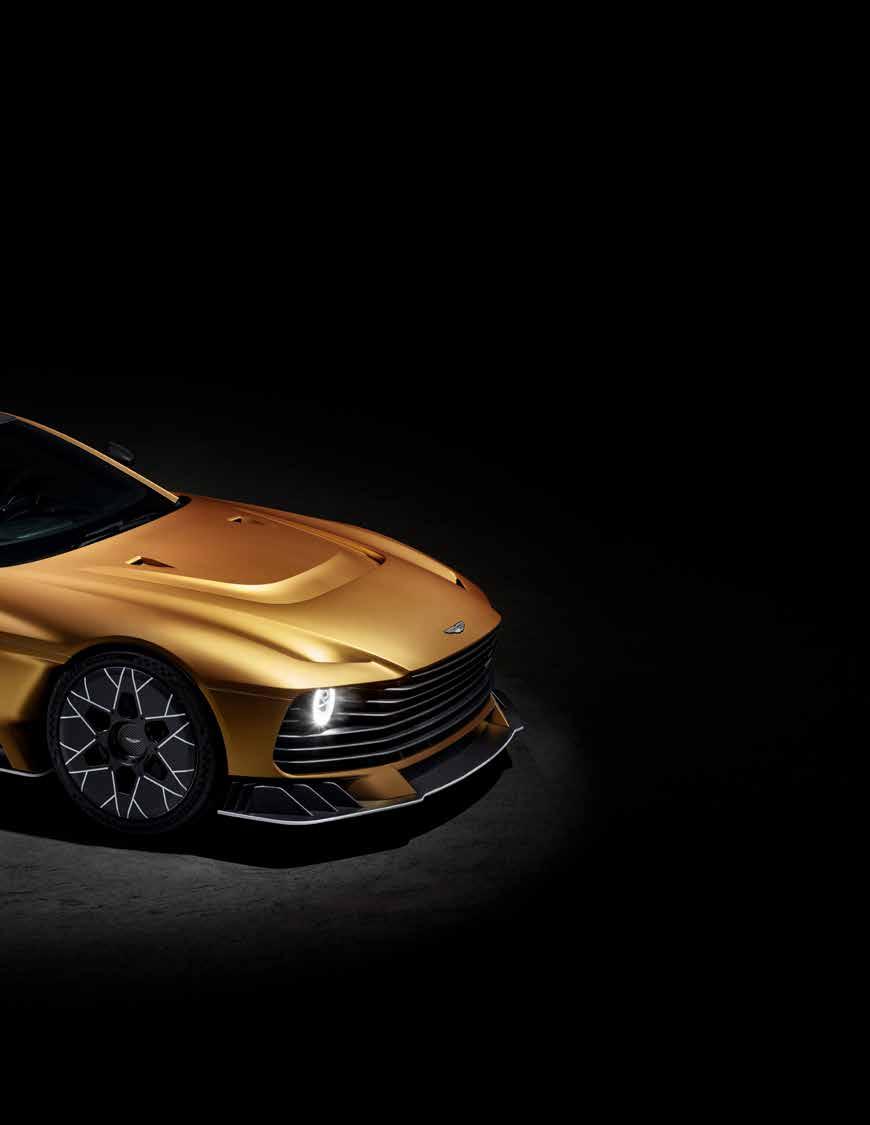 yet still useable on the road, it takes clear inspiration from motorsport, expressing its character through dramatic, muscular form and a plethora of beautiful, functional details. Amongst these are aero disc wheel covers, which are a nod to the mighty ‘Muncher’ Le Mans car, and a quartet of large diameter titanium exhaust pipes which honour the internal combustion and celebrate the soundtrack of Aston Martin’s magnificent V12”.