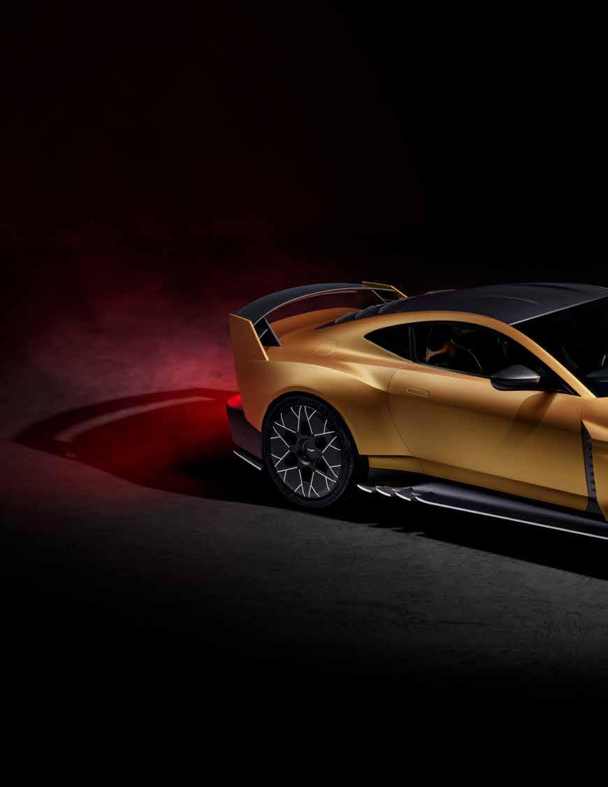 in harmony with the front splitter end planes, the broad side sills and upswept vortex generators located ahead of the rear wheels smooth airflow along the flanks, reducing turbulence, drag and lift.