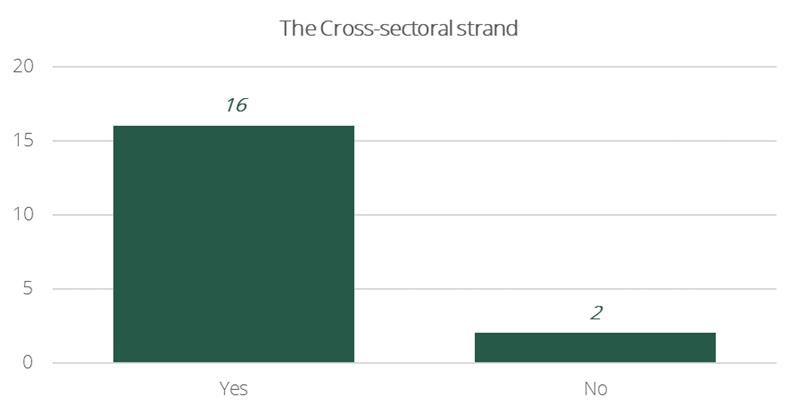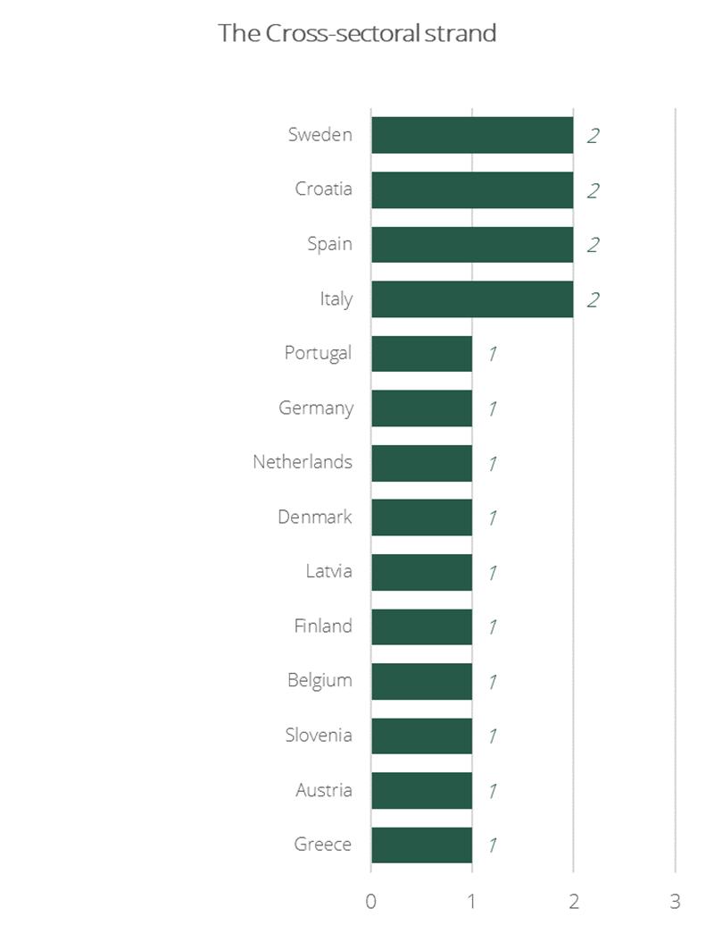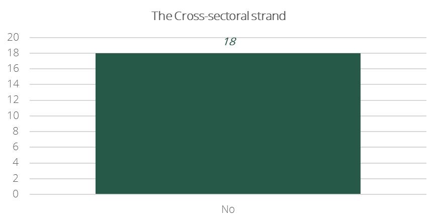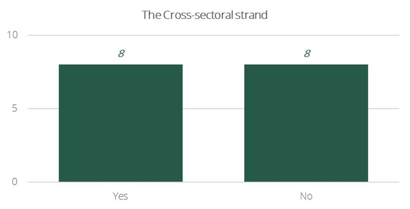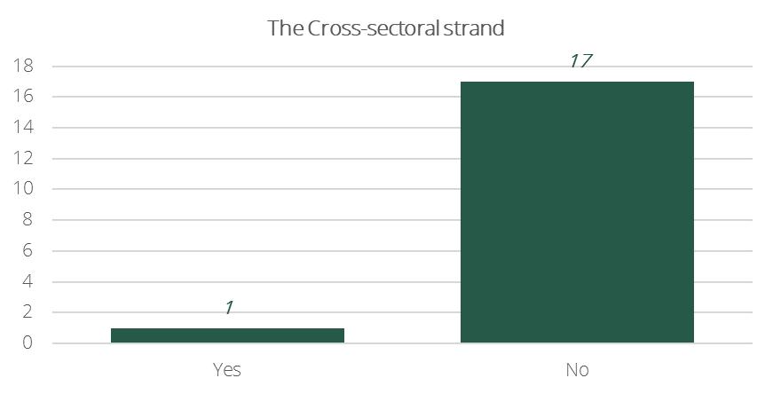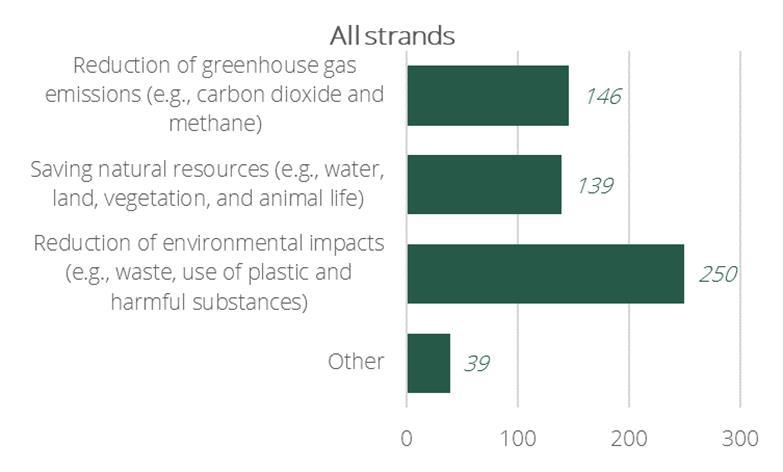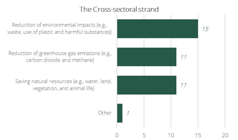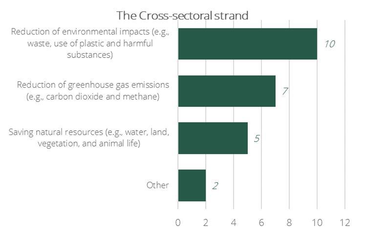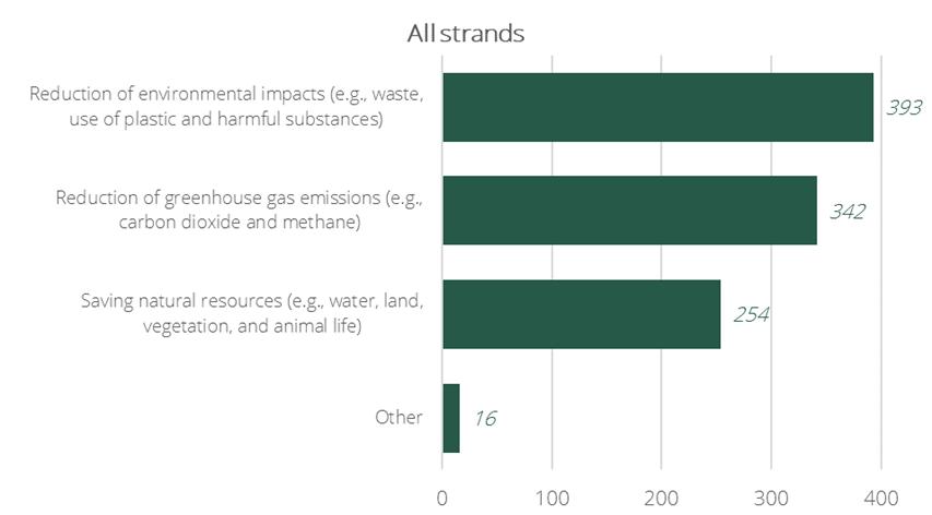 Illustrates the share of funding allocated to projects that carried out at least one activity towards climate change, environmental and sustainability objectives during a programme period under a particular programme strand