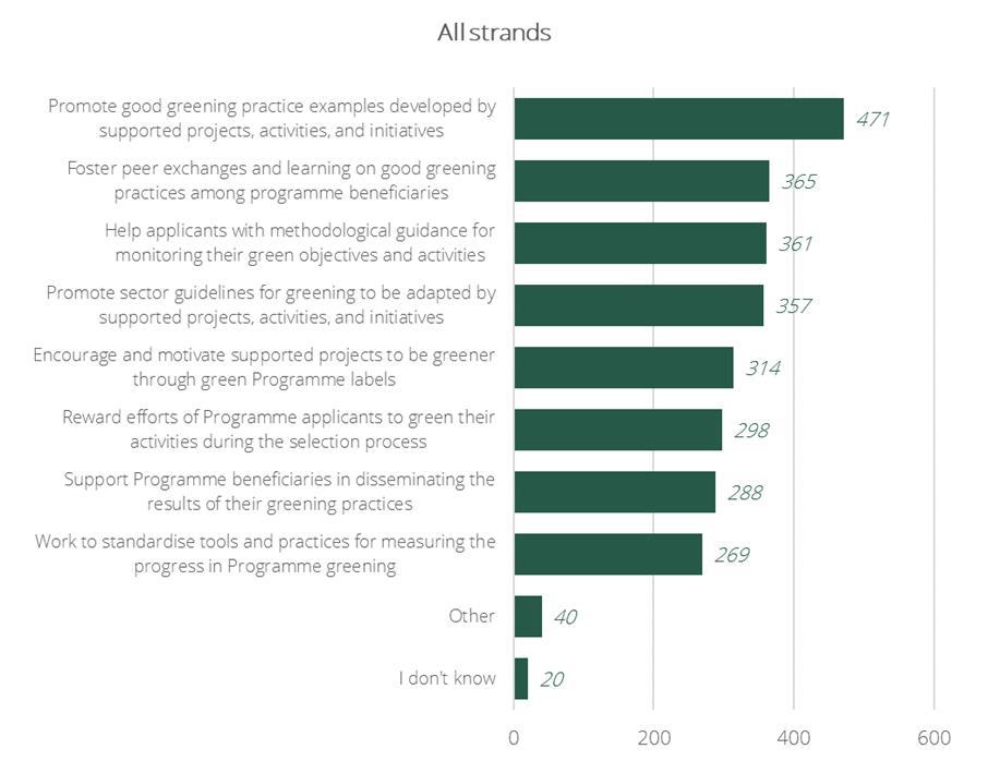 • Programme greening is predominantly achieved through greening activities of its supported projects (i.e., the internal dimension of programme greening)281. This is the area where greening can be incentivised, rewarded and guided by programme managers. It is also the area that should be the main focus of measurement of programme greening in the future and where programme can have compulsory greening requirements during future programme iterations as these are justified by European climate law as well as required by the EU budget targets and Green Deal objectives.