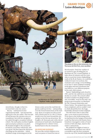 Morrhonnière-Petit Port: neither of us wanted to put off riding the Les Machines de l’Île’s Grand Éléphant. It takes about 40 minutes and two tram rides to reach the former shipbuilding yards of the Île de Nantes; we could have walked it in just over an hour, but wanted to save energy. It was thrilling to see the 12-metre elephant standing in the glass and steel warehouse that was built for a very different purpose in the early 20th century. Nantes’ shipbuilding yards closed in 1987, and the city suffered an economic decline as a result. The council called for ideas to bolster its ailing fortunes and, incredibly, went for the mad-cap projects put forward by Les Machines de l’Île’s François Delarozière and Pierre Orefice. Two projects have since been completed, and we couldn’t wait to climb aboard the first: the huge, beautifully adorned wooden elephant. Our ride wasn’t due to start until 2pm, so we went in search of lunch. To be close to the forthcoming action we had lunch in the hangar at Stereolux, a café/bar that serves the theatre there. Somehow I managed to order a French version of fish and chips, much to the waiter’s amusement. We climbed two flights of stairs to board the beast, and there was a bit of a scramble to get the best viewpoint from the top of the howdah (elephant www.practicalmotorhome.com | July 2015 | 29