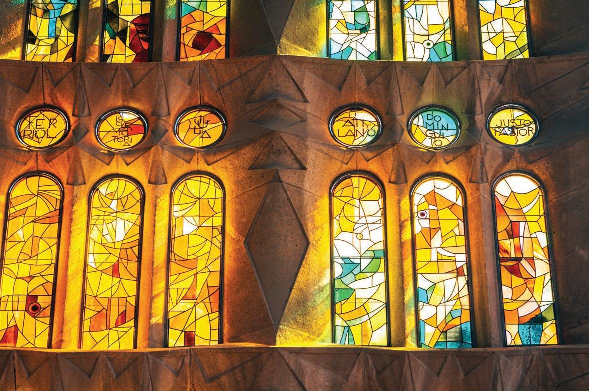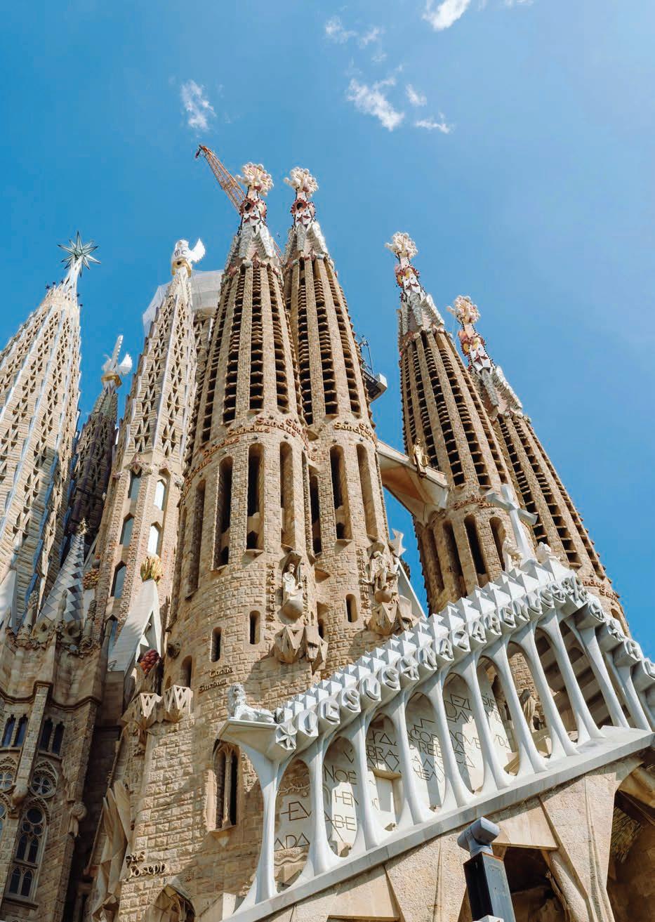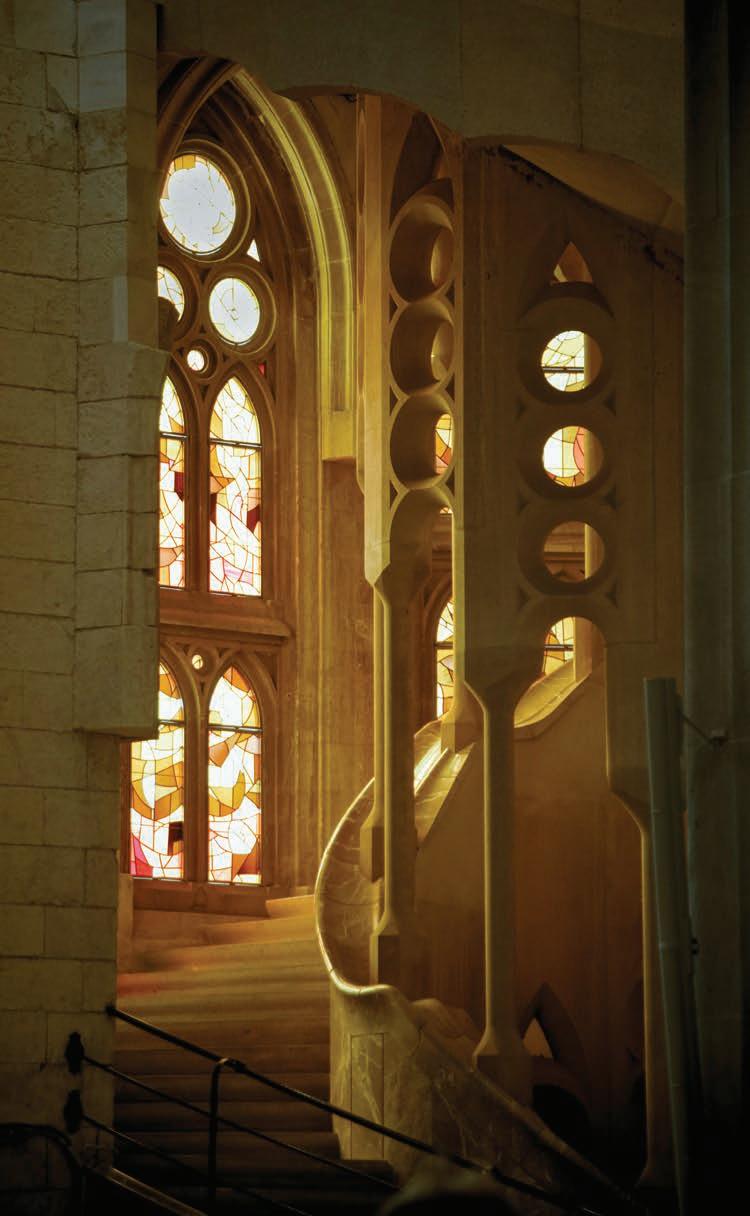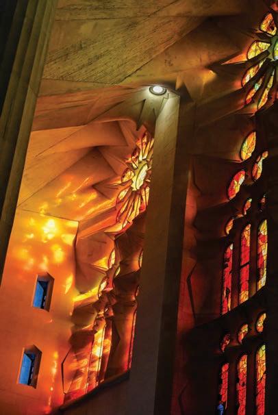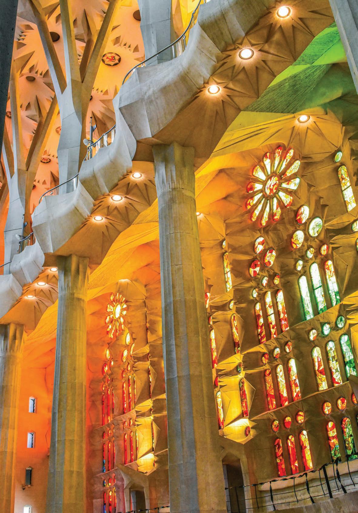 Left: The basilica’s interior, completed in recent years, reveals Gaudí’s geometric language in stone, light and colour. Photo Bo Zhang.