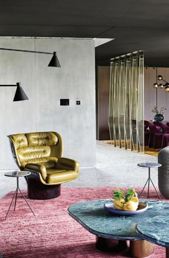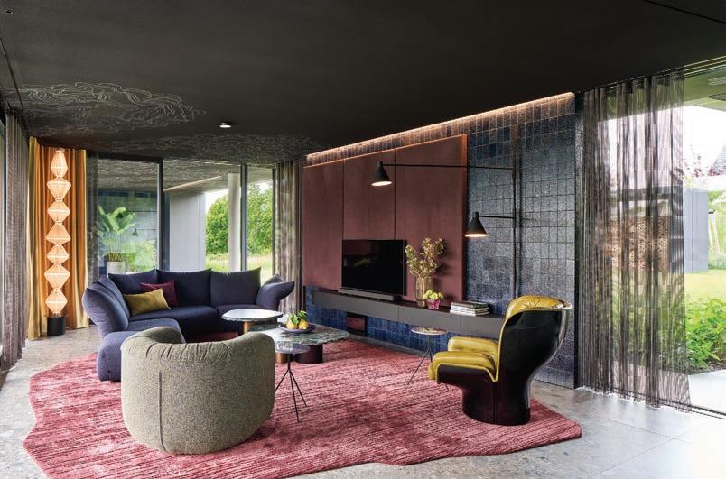 The resulting interior is open-plan, with zones that flow into one another while maintaining distinct identities. The black ceiling acts as a unifying element, setting a dramatic backdrop against which sculptural pieces take on a heightened presence. Furniture, lighting and objects are treated almost as characters within the space, each defined by its form, colour and materiality. Glossy surfaces, matte finishes and softly absorbent textures interact with daylight in shifting ways, subtly altering the perception of depth and scale throughout the day.