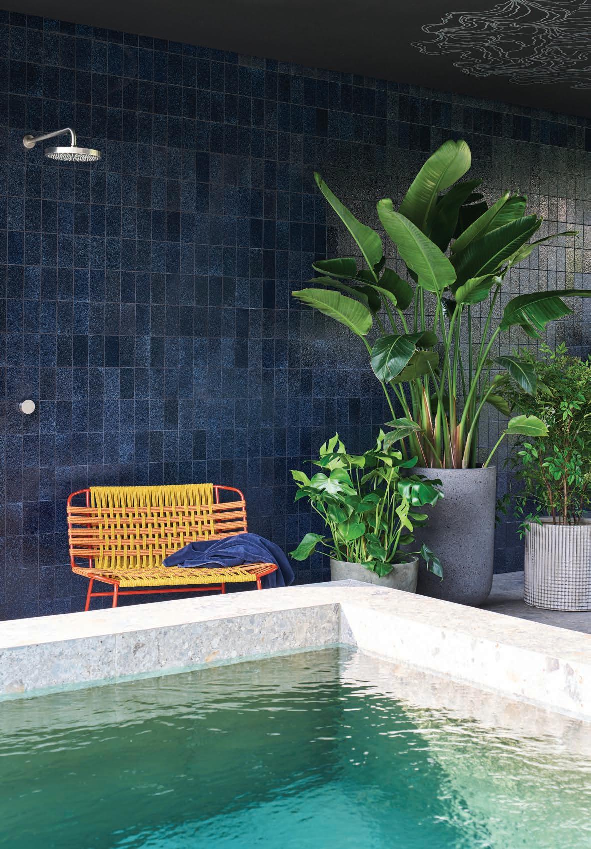 Left: Interior and exterior share the same stone flooring, creating a seamless transition from living spaces to terrace and pool. A black acoustic ceiling with fine graphic linework introduces a subtle rhythm that unifies the lounge, terrace and pool area.