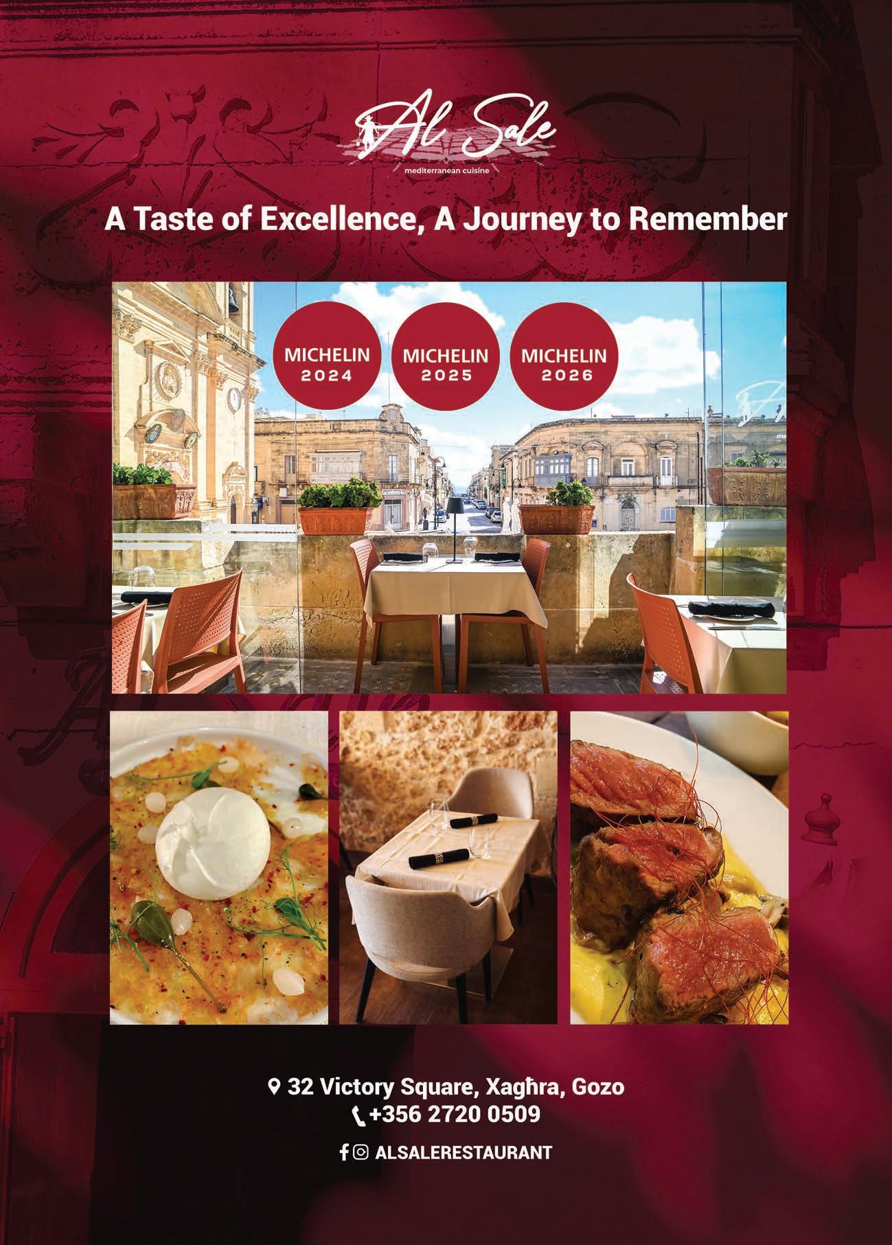 In Xagħra’s main square, Al Sale offers a poised yet informal approach to Mediterranean cooking. Now recognised by the MICHELIN Guide Malta for the third consecutive year, it reflects chefowner Christopher Pace’s ingredient-led philosophy, built around fresh produce, aged meats and light, flavour-driven dishes. Olive oil takes precedence in the kitchen, giving the food a clean, direct character. The menu shifts with the seasons, from seabass Al Sale to prawn-and-scallop ravioli with prawn bisque and carefully handled cuts of meat, supported by a carefully curated wine list with options by the glass. Pace’s focus on good food and genuine hospitality shapes the atmosphere, whether on the sunlit terrace or within the warm stone-clad interiors. As the guide notes, everything here is “uncomplicated, ingredient-led and freshly prepared. An international wine list and friendly, attentive yet unstuffy service round off the overall experience.“