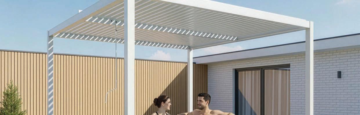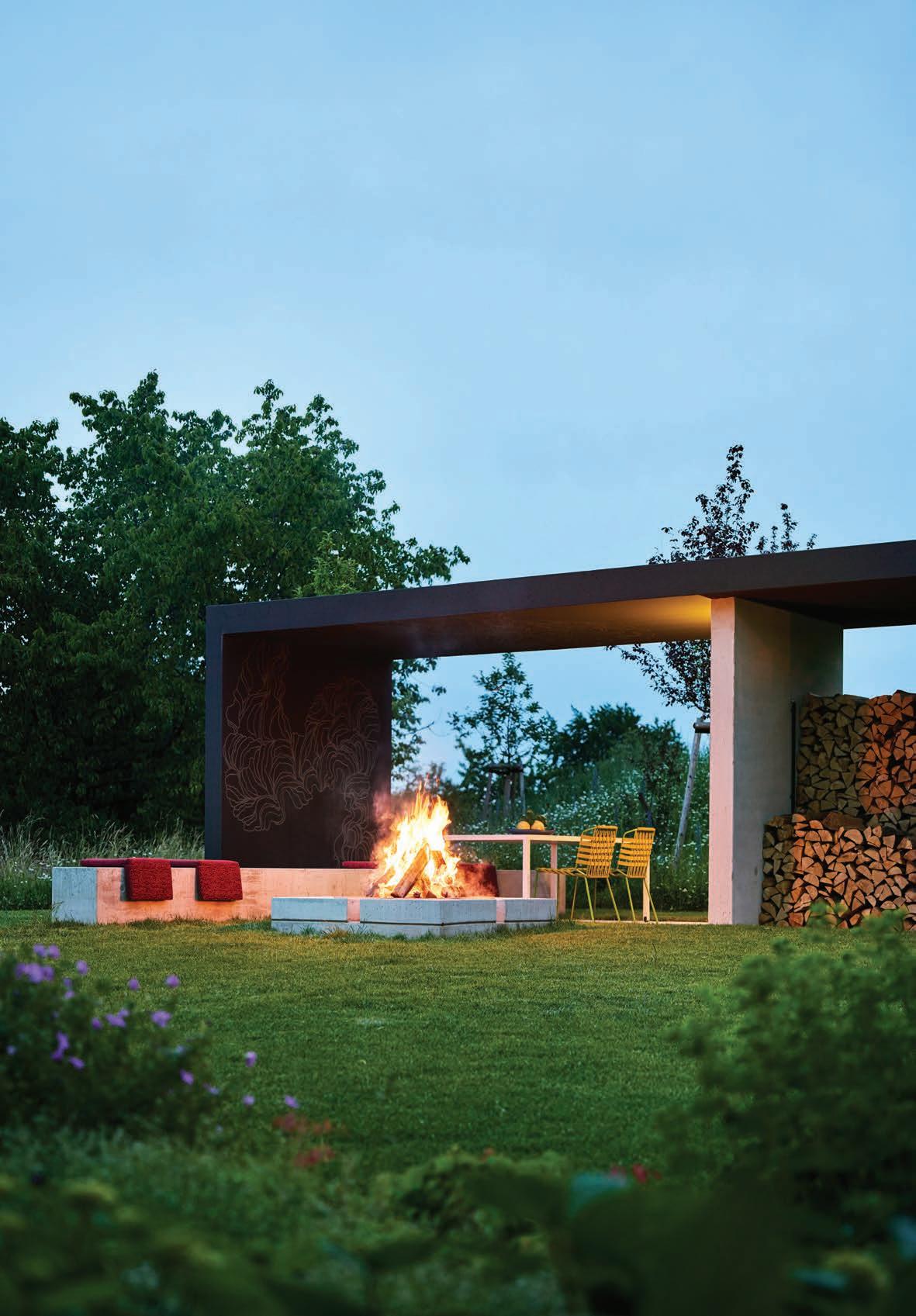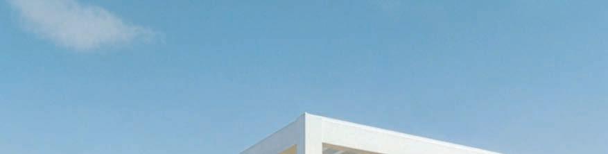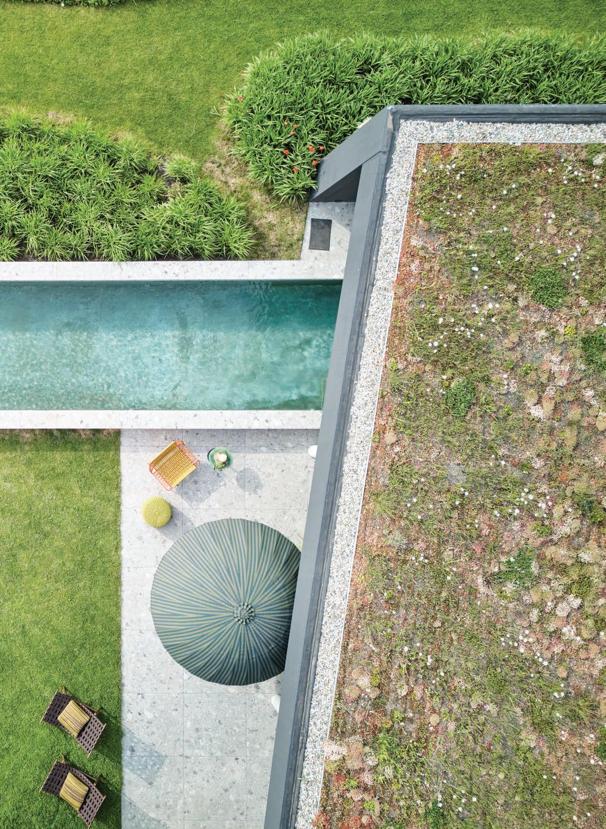 guest area, a sheltered garden with a fireplace, and the main garden with its terrace and pool. The garages occupy the north-south wing, while the carport and covered terrace run eastwest. All functions sit on a single level, ensuring seamless, barrier-free movement throughout.