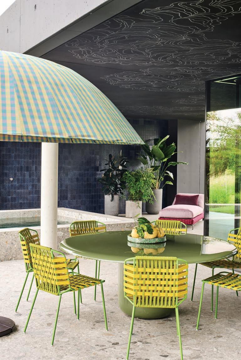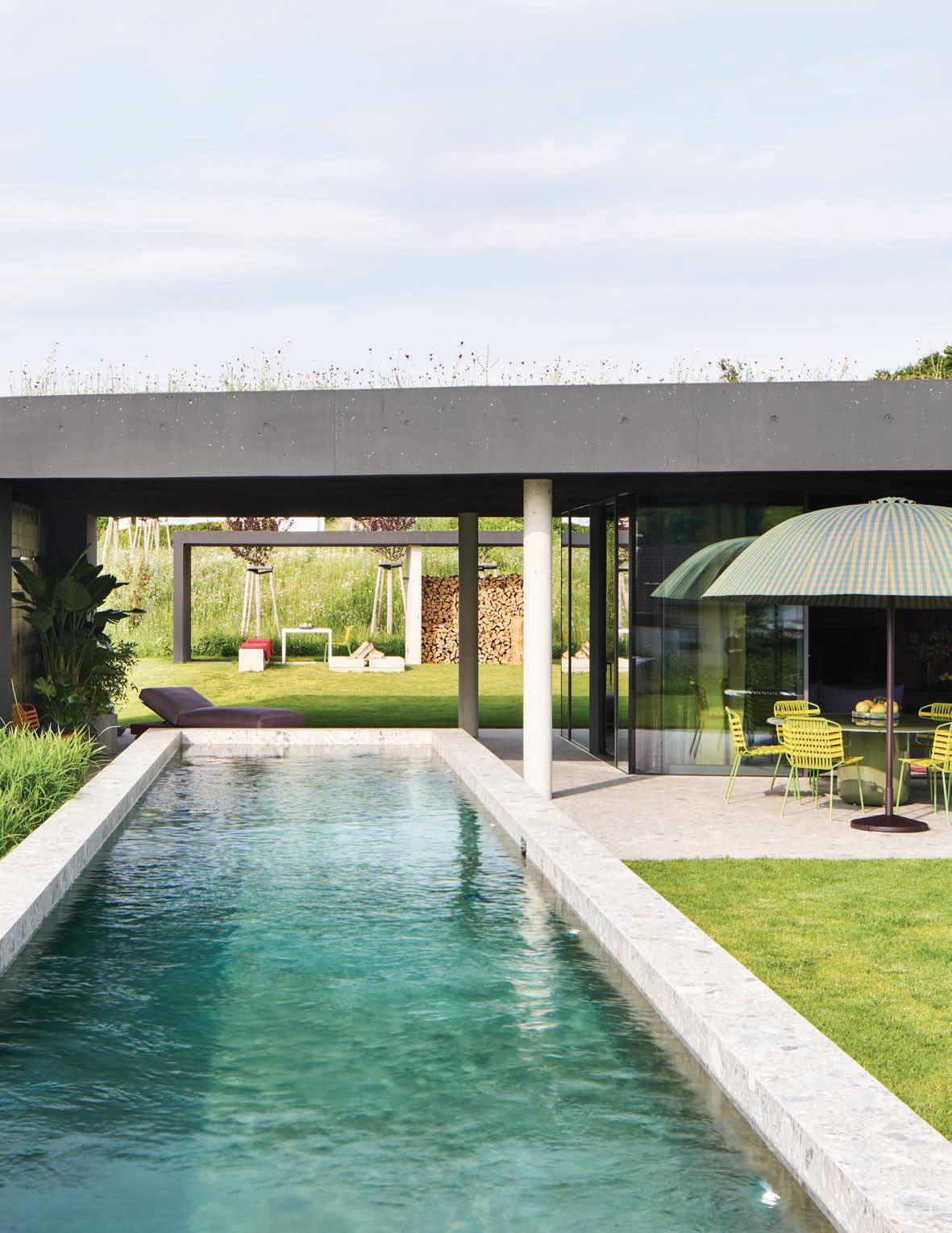 Right: A covered terrace creates a sheltered threshold between the interior and the pool, offering a shaded vantage point over the garden.