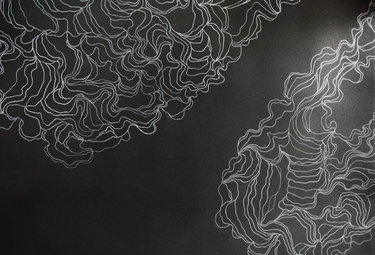 In the projecting lounge area, the architecture reaches out into the landscape, creating a space that feels suspended between interior and exterior. A continuous material language reinforces this connection, while a graphic ceiling design introduces a layer of visual rhythm. The finely drawn linework extends from the lounge to the covered pool area and onwards to the outdoor fire pit, which sits slightly apart from the main volume. The graphic motif, animated and seemingly spontaneous, provides a counterpoint to the strict geometry of the glazing and the disciplined lines of the pool.