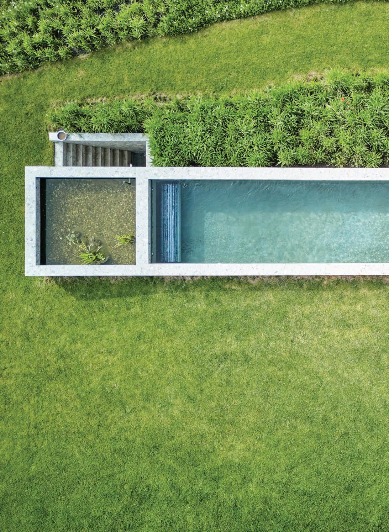 The pool, cast in exposed concrete, is narrow and elongated for swimming, beginning beneath the covered terrace and stretching outwards to follow the natural topography. Its height is calibrated so that one can sit directly at the water’s edge, creating a subtle connection between body and landscape.