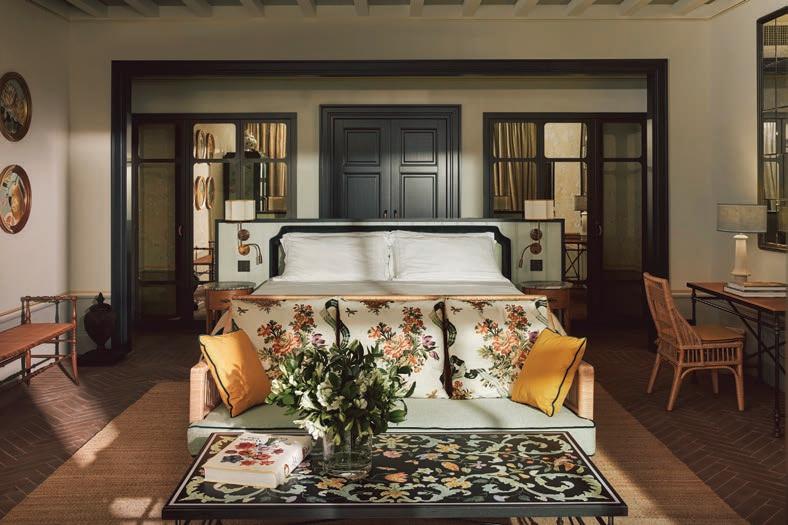 overlooking the gardens. The Grand Tour Suite, once Napoleon Bonaparte’s private residence, stretches across the entire first floor, its windows framing the same views that captivated 18th century travellers. Tuscan marble, neoclassical tapestries and antique furnishings create a residential atmosphere, softened by a chalk toned palette. Botanica, meanwhile, draws inspiration from the villa’s gardens and the surrounding woodland. Frescoed boiserie, scagliola tables by Florentine artisans Bianco Bianchi, and botanical textiles create a playful interplay between art and nature.