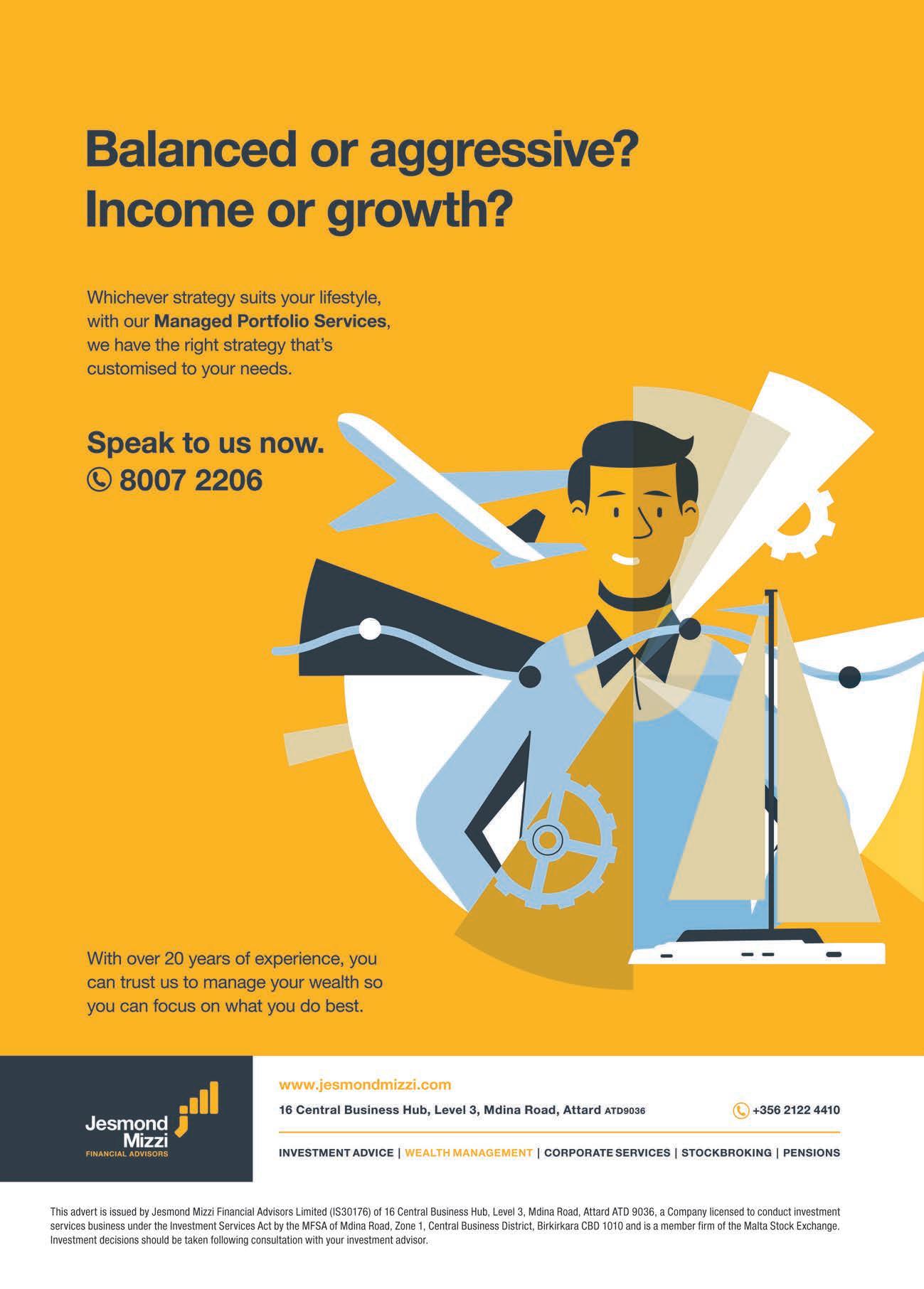 This article does not intend to give investment advice, and the contents therein should not be construed as such. Any products/services referred to in this interview may not be suitable or appropriate for every investor. Jesmond Mizzi Financial Advisors (IS30176) is licensed to conduct investment services business by the MFSA under the Investment Services Act and is a member of the Malta Stock Exchange. For more information, contact Jesmond Mizzi Financial Advisors Ltd of 16 Central Business Hub, Level 3, Mdina Road, Attard ATD 9036, on tel. 2122 4410, or email Jesmond.mizzi@jesmondmizzi.com