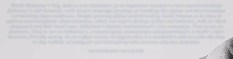 World Alzheimer’s Day, held on 21st September, is an important moment to raise awareness about Alzheimer’s and dementia, with 2024’s campaign focusing on breaking the stigma and discrimination surrounding these conditions. Despite growing global understanding, much remains to be done to address misconceptions about dementia, which can lead to feelings of fear and isolation, both for those diagnosed and their loved ones. Alzheimer’s Disease International’s 2024 campaign, Time to act on dementia, Time to act on Alzheimer’s, is encouraging communities and governments to build a more dementia-friendly society. As we reflect on how to support this, it is essential to also consider the dayto-day realities of caring for and interacting with someone who has dementia.
