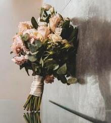 A dreamy mix of blush roses, soft ivory blooms, and fresh eucalyptus, hand-tied for that effortless, romantic look with Fowers by Nanette.