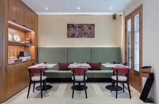The curved wooden fittings and panelling are a subtle homage to the curved balcony of the Grandmasters’ Palace’s located just up the road. The colours of the interior are easy on the eye, promoting a sense of warmth, comfort, and tranquility. The hint of green, the redness of the wood and the natural tone of the stone form a colour and texture palete that is warm and welcoming, yet refreshing to the senses, and which invites diners to relax and engage with their ambiance.