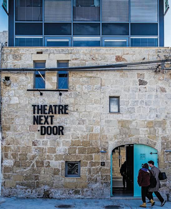 e tried to keep the design throughout very clean. It is in our usual language, a mix of old and new. We never replicate or fake history,” Keith Pillow says. “The reception area is representative of our approach.” The materials of the reception counter – rough stone with a backdrop of Corten steel – are raw and suggestive of the building’s seting in Maghtab with its associated quarries and scrapyards. A preserved olive tree complete with olives – which looks impressively real – appears to grow out of the bench separating the hall space from a ramp that enables access to all abilities. It gives a sense of the rural farm that the space once was, and can be seen as a symbol of the wider Mediterranean context. The fabric-covered Flos chandelier has the feeling of a ghost lamp, evoking the spirit of the Phantom of the Opera, which has become a byword for musical theatre.