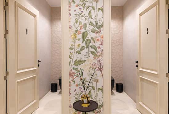 Botanical print wallpaper adds visual interest. Its greenery echoes the colour accents found throughout the interior and complements the soft-toned palette of the restrooms. The sanitary ware and accessories were supplied by Farell Bathrooms.
