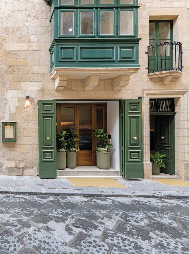 Although the space is located within a historic building, the sense one has upon entering is of being in a familiar traditional Maltese townhouse, an experience conveyed by elements such as the traditional green tones of the wooden doors with their gleaming brass knockers in the shape of a lion’s head, and the welcoming feel of a antiporta that is visible from the street, a classic feature of traditional stone townhouses that is now, more ofen than not, kept hidden from view behind closed front doors.
