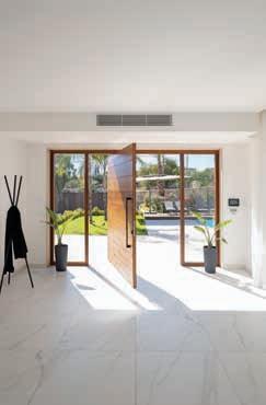 Above: The dramatic oversized wooden front door, one of the key design features for the house, was crafted by Futura Woodworks. Their woodworking flows throughout the property, from the sleek customised wooden kitchen to the wooden wall paneling and bespoke furniture.