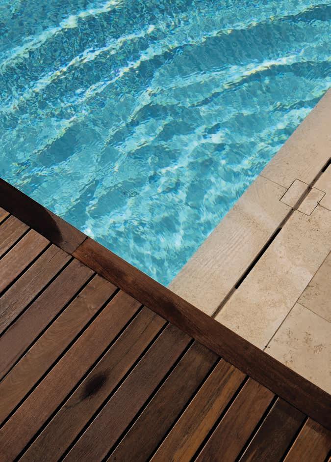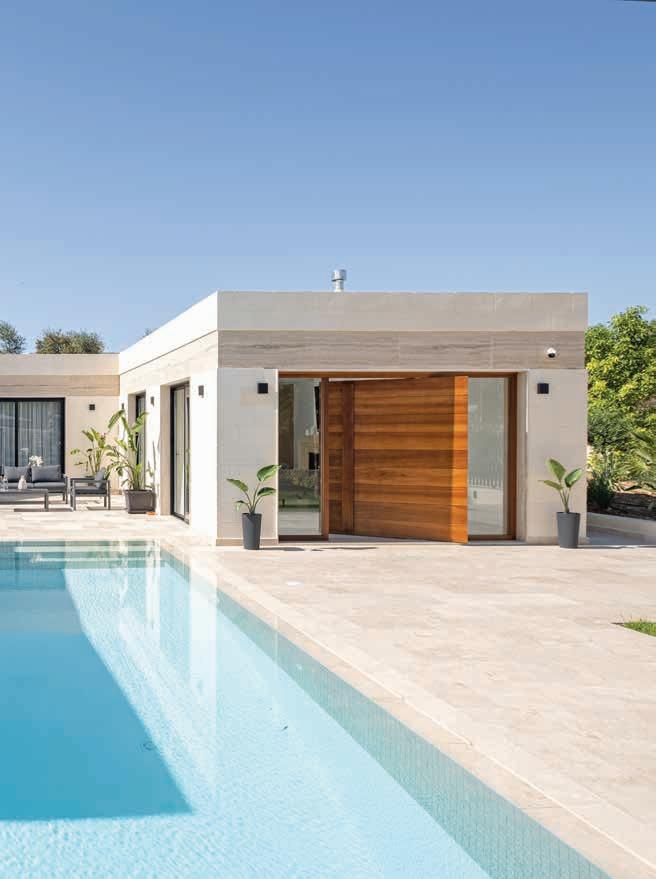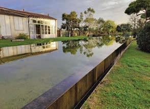 arms of the apparently onestorey building embrace the comfortably large swimming pool. The interior of the pool is white, lending the aquamarine water an ethereal quality as it shimmers in the sunshine. At the end of the pool, a floating sundeck provides a viewing point that frames the house elevation yet also captures a segment of the landscape scenery. When the exterior elevations of the house were being designed, it was the viewpoint from the sundeck that was key