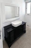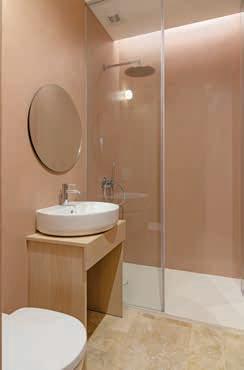 Visual texture and warmth define the look of the interior. The smoothness of the wooden furniture and stone floors contrasts with the rough texture of the original ceiling. A round mirror and curved sanitary ware from Satariano soften the angularity of the bathroom and shower.