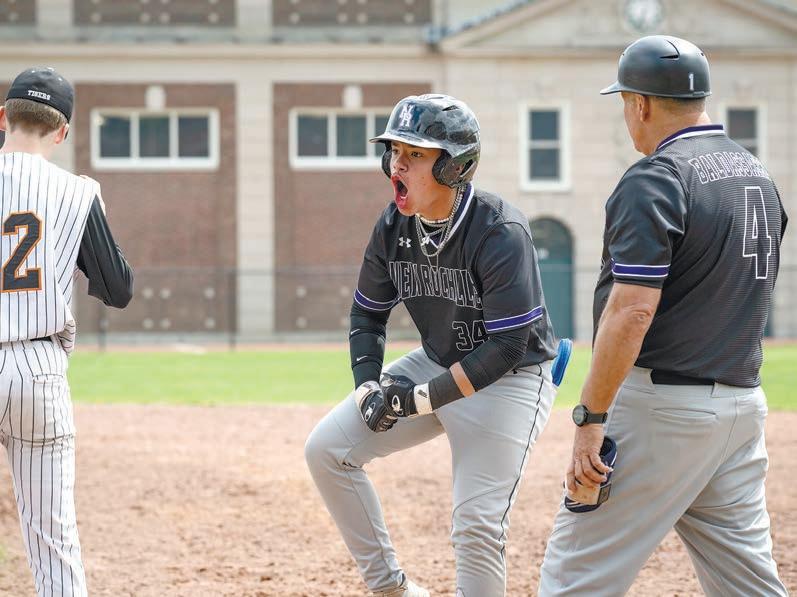 Graham Williams and the Mamaroneck Tigers celebrate after Williams’ extra-inning sac fly gives the Tigers a 9-8 win over New Rochelle on April 20. Williams also picked up the win in relief for Mamaroenck. For story, see page 16.