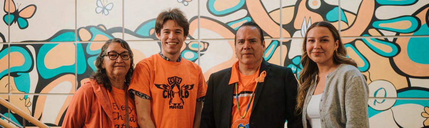 Speakers at the Orange Shirt Day Walk pictured in front of the new mural in the Helen Glass Centre for Nursing atrium. Karen Cochrane, Grandmother in residence; Judah Chepil, NSA senior stick; Garrison Settee, Grand Chief of Manitoba Keewatinowi Okimakanak; and Kayleigh Pagee, NSA Indigenous student representative.