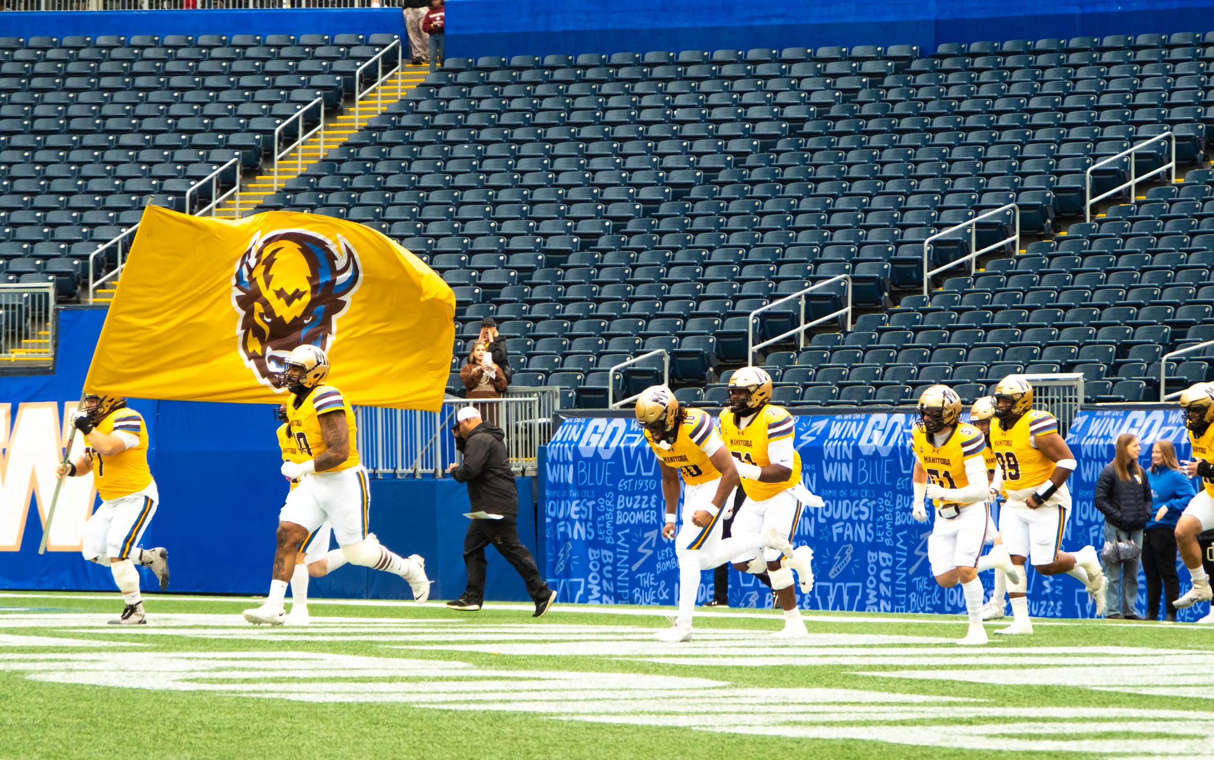 THE BISONS FOOTBALL TEAM REVEALS THE NEW BISONS LOGO AT THE START OF THEIR GAME AGAINST THE U OF A GOLDEN BEARS