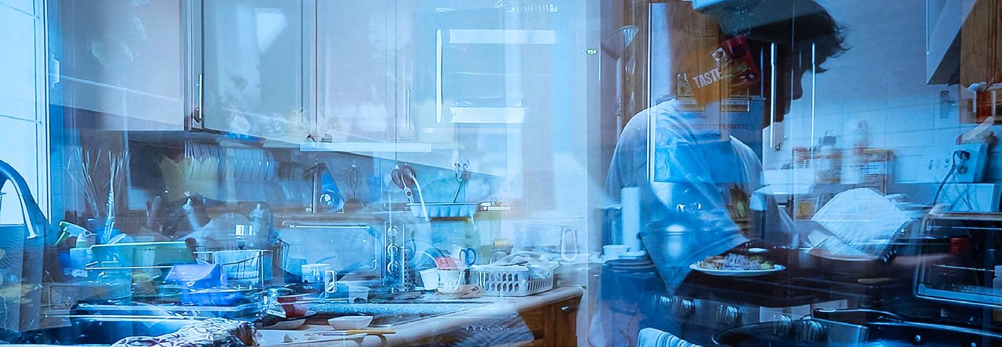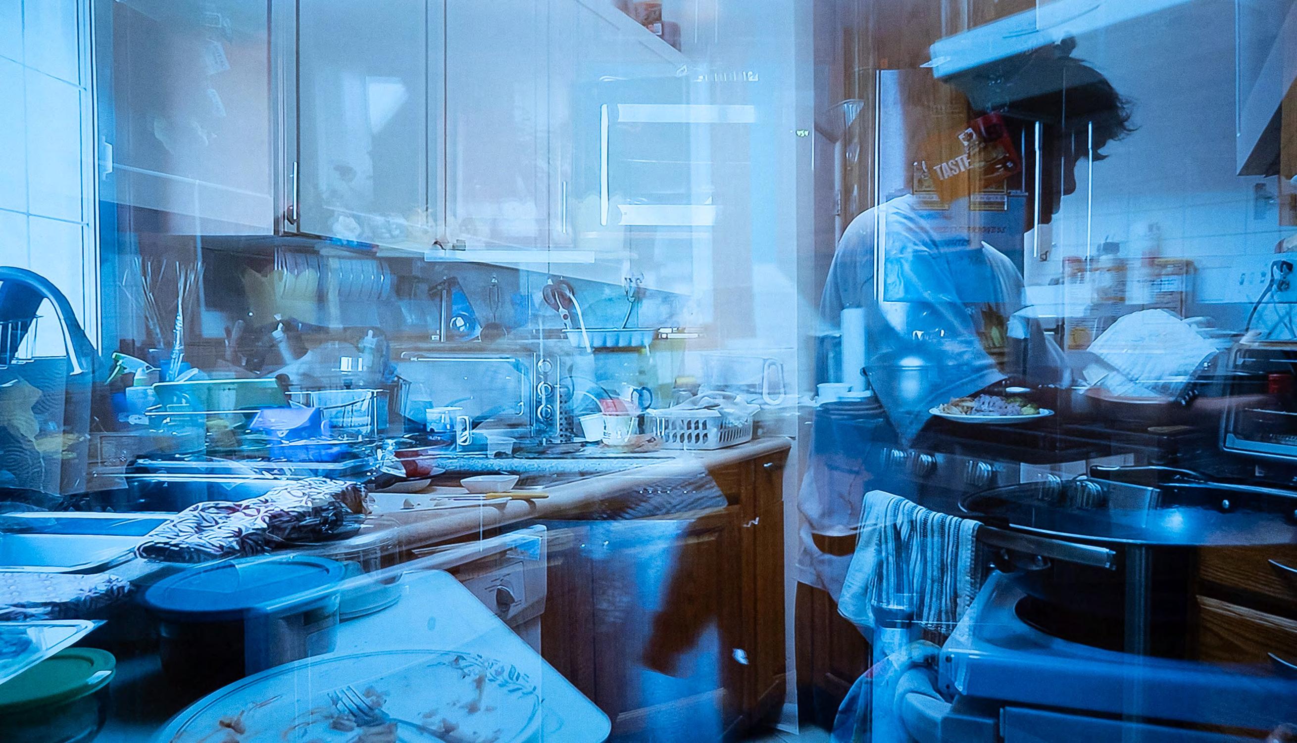For the exhibition, students were asked to create works as if they were excavating the hidden crevices of their homes’ couch cushions. Pamela Baptista, for example, made “Specters of a Kitchen,” a screen that plays overlayed footage of a domestic kitchen while flanked by weathered shopping lists and photographs.
