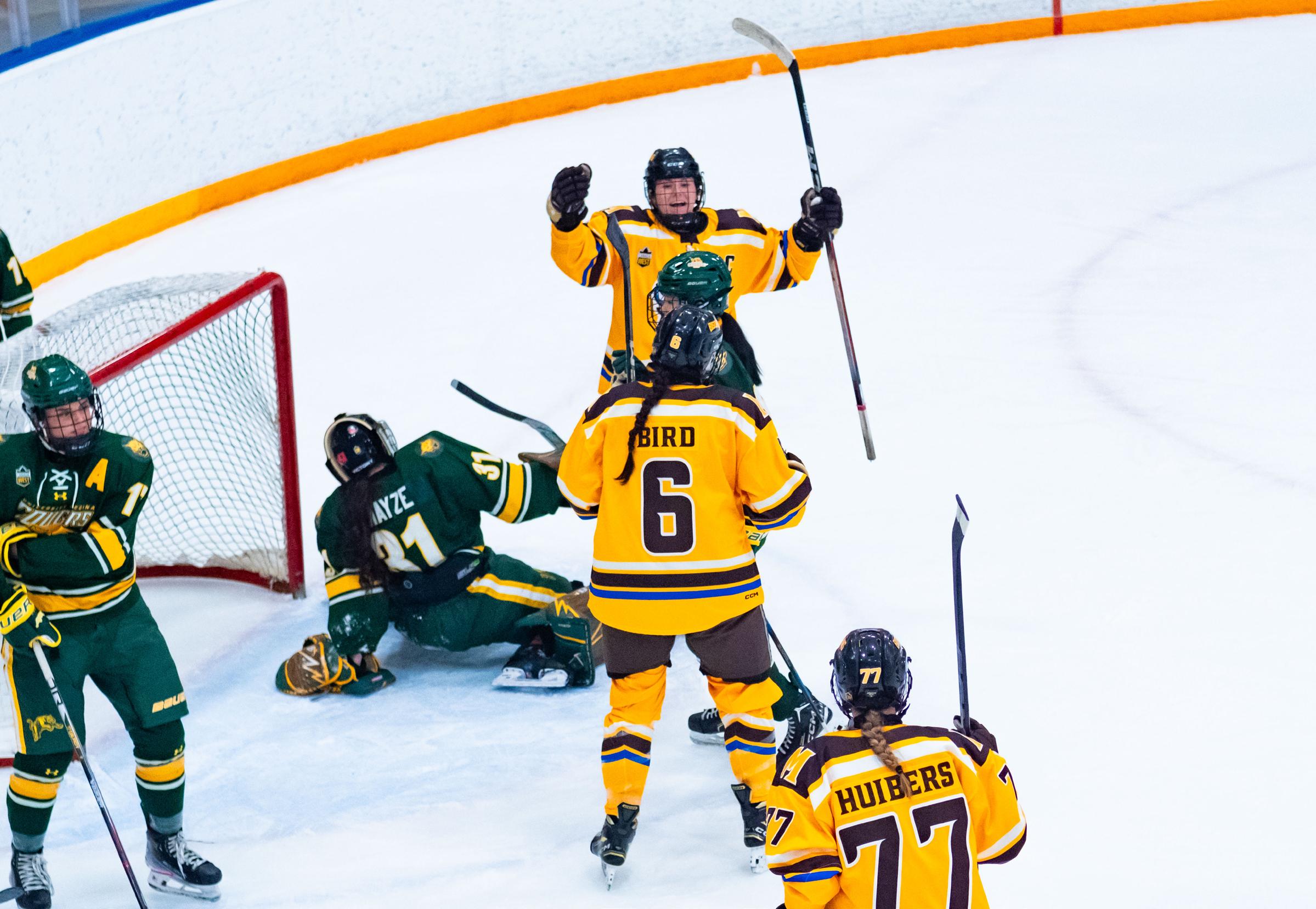The Bisons quickly responded with two powerplay goals. Kelsey Huibers scored in the ninth minute [9:25], assisted by Patrick, and Brenna Nicol added the fifth goal 25 seconds after [9:50], assisted by Sadie Keller.