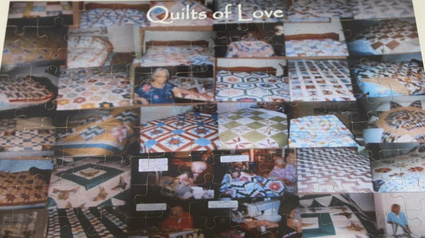I currently sleep under #110, a king-size beauty which she let me pick out. I took many pictures of her quilts over the years, and eventually I took a picture of those pictures. I had a puzzle made of the picture. Putting it together was, in a small way, like piecing a quilt. Bit by bit, I saw something lovely develop. Quilts are pieces of people’s stories, and if you are lucky enough to have a quilter in your family, they provide us not with a covering, but a cover that is a “quilt of love.”