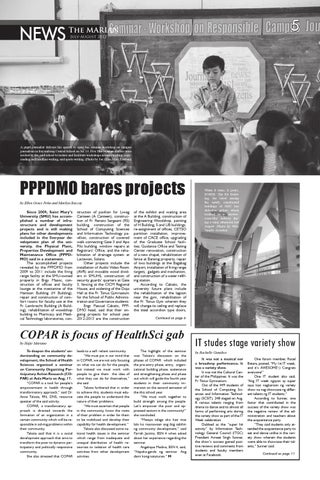 struction of pavilion for Liwag Canteen (A Canteen), construction of Fr. Renato Sergeant (RS) building, construction of the School of Computing Sciences and Information Technology pavillion, construction of covered walk connecting Gate 3 and Apo Pilo building, window repairs at Registrars’ Office, and the rehabilitation of drainage system at Lactawan, Solano. Other projects include the installation of Audio Video Room (AVR) and movable wood dividers in SMUHS, construction of security guards’ quarters at Gate 3, fencing at the CICM Regional House, and widening of the Dojo Hall at the Fr. Tonus Gymnasium for the School of Public Administration and Governance students. Engr. Pascual Cabatic, PPPDMO head, said that their ongoing projects for school year 2012-2013 are the construction
