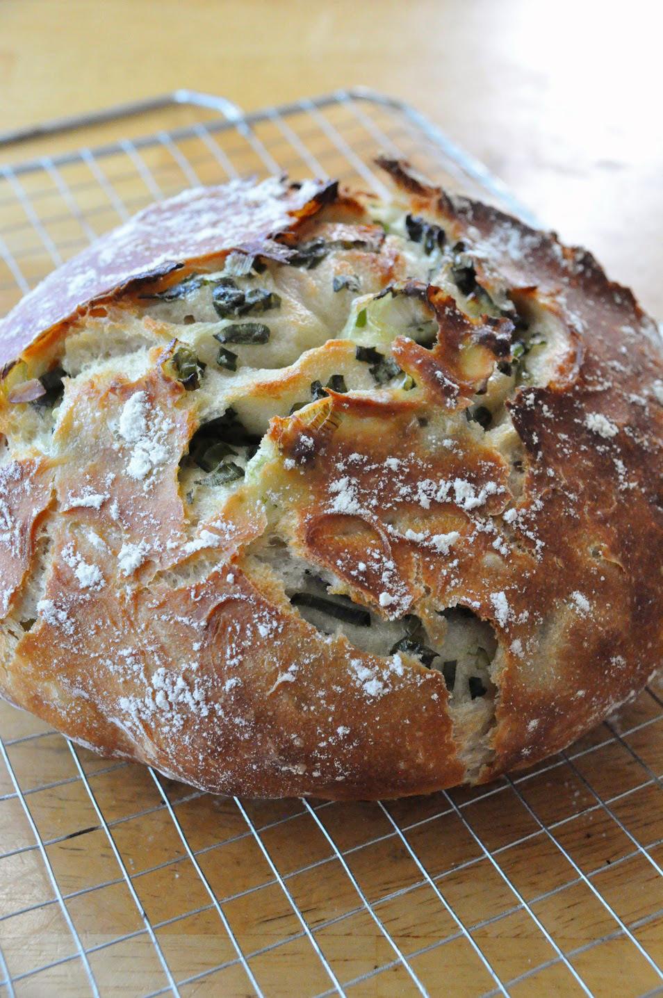 Instead of dividing up the dough keep it whole, then follow the same steps as above. Chop scallions and garlic, then spread in an even coat leaving a boarder. Roll rst into a tube, then around itself to make a loaf. Pinch the dough shut to keep it from unrolling. Let it rise for 20 minutes, and preheat dutch oven (or other rounded, oven safe container) for 30 minutes at 450º. en place the loaf inside, and bake in a 450º oven for another 30 minutes covered, and then remove the lid and bake an additional ve minutes.