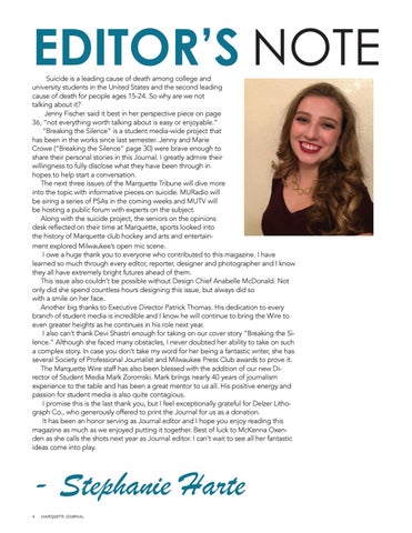 Suicide is a leading cause of death among college and university students in the United States and the second leading cause of death for people ages 15-24. So why are we not talking about it? Jenny Fischer said it best in her perspective piece on page 36, “not everything worth talking about is easy or enjoyable.” “Breaking the Silence” is a student media-wide project that has been in the works since last semester. Jenny and Marie Crowe (“Breaking the Silence” page 30) were brave enough to share their personal stories in this Journal. I greatly admire their willingness to fully disclose what they have been through in hopes to help start a conversation. The next three issues of the Marquette Tribune will dive more into the topic with informative pieces on suicide. MURadio will be airing a series of PSAs in the coming weeks and MUTV will be hosting a public forum with experts on the subject. Along with the suicide project, the seniors on the opinions desk reflected on their time at Marquette, sports looked into the history of Marquette club hockey and arts and entertainment explored Milwaukee’s open mic scene. I owe a huge thank you to everyone who contributed to this magazine. I have learned so much through every editor, reporter, designer and photographer and I know they all have extremely bright futures ahead of them. This issue also couldn’t be possible without Design Chief Anabelle McDonald. Not only did she spend countless hours designing this issue, but always did so with a smile on her face. Another big thanks to Executive Director Patrick Thomas. His dedication to every branch of student media is incredible and I know he will continue to bring the Wire to even greater heights as he continues in his role next year. I also can’t thank Devi Shastri enough for taking on our cover story “Breaking the Silence.” Although she faced many obstacles, I never doubted her ability to take on such a complex story. In case you don’t take my word for her being a fantastic writer, she has several Society of Professional Journalist and Milwaukee Press Club awards to prove it. The Marquette Wire staff has also been blessed with the addition of our new Director of Student Media Mark Zoromski. Mark brings nearly 40 years of journalism experience to the table and has been a great mentor to us all. His positive energy and passion for student media is also quite contagious. I promise this is the last thank you, but I feel exceptionally grateful for Delzer Lithograph Co., who generously offered to print the Journal for us as a donation. It has been an honor serving as Journal editor and I hope you enjoy reading this magazine as much as we enjoyed putting it together. Best of luck to McKenna Oxenden as she calls the shots next year as Journal editor. I can’t wait to see all her fantastic ideas come into play.
