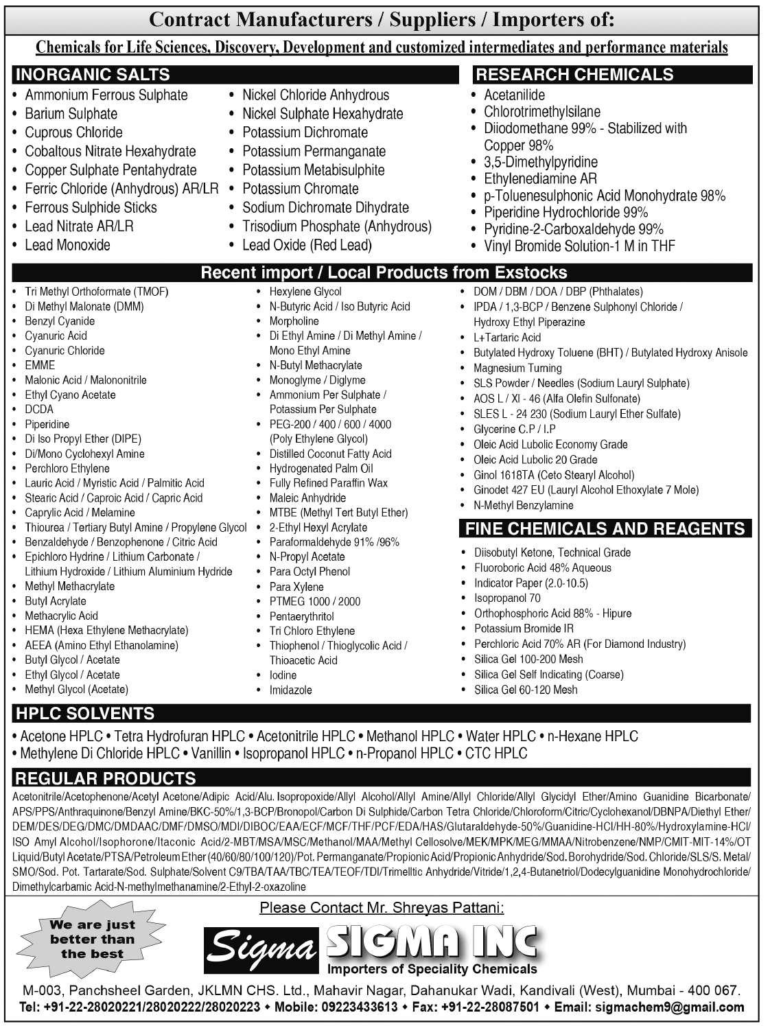 16 May - 31 May 2024 Vol. 20 Issue 10, Pages 220 LORNOXICAM INH ETHYL OLEATE IP/BP/ USP SUCRALFATE USP With GMP and DMF For More Products Please Visit Page No. 29 marketing@progresslifesciences.com +91 22 4978 1414 Manufacturer and Exporter of P PR RO OG GR RE ES SS S LI IFFE E S SCCIIEENNCCEES S P PVVT T L LT TD www.mazadapharmaguide.com 20th Years of Publication FORMULATERS PRODUCT PROFILE: 116-118 ARIHEET PHARMACHEM LLP NI NIACIN CIN AMIDE MIDE IP IP/BP BP SALBUTLBUTAMOL MOL SULPH SULPHATE TE IP LITHIUM CARBON RBON ATE TE TR TRAZODONE ZODONE HCL USP Partner : Kevin Doshi Mob No: +91 9022243743 / 7021299060 Email Id: kevin@ariheetpharma.Com Website: www.ariheetpharma.Com Ready Stock Ex Bhiwandi Manufacturing & Exporting Superior Quality Precious Metal Chemicals, Compounds of Rhodium, Gold, Silver, Palladium, Platinum, Iridium, Osmium, Ruthenium, Indium, Bismuth, Molybdenum Etc. INdIAN PlATiNUM PVT. LTd. Email: indianplatinum@gmail.com For Product Refer Page No. 170 llll llll lll PRUDENCE PHARMA CHEM – Ankleshwar sales@prudencepharma.com 0091-2646-222825 Cell No: + 91-9825205460 / 9624042444 MANUFACTURER & EXPORTER OF l RIVAROXABAN l GLIMEPIRIDE l TORSEMIDE l SILODOSIN l FEBUXOSTAT l MEMANTINE