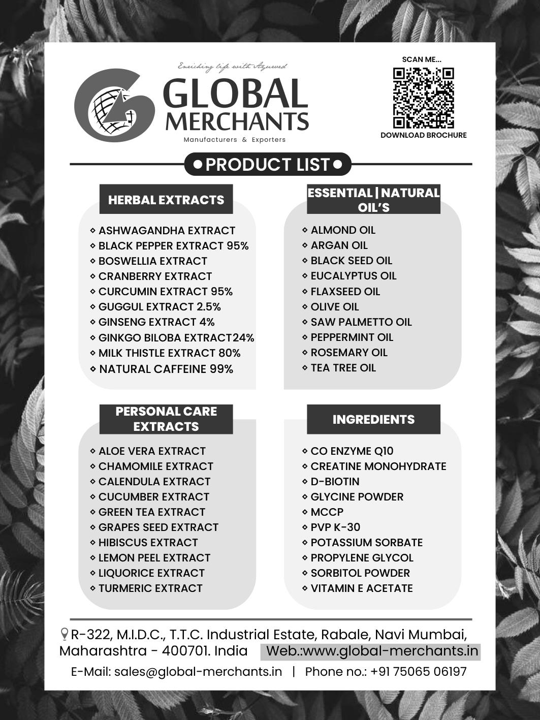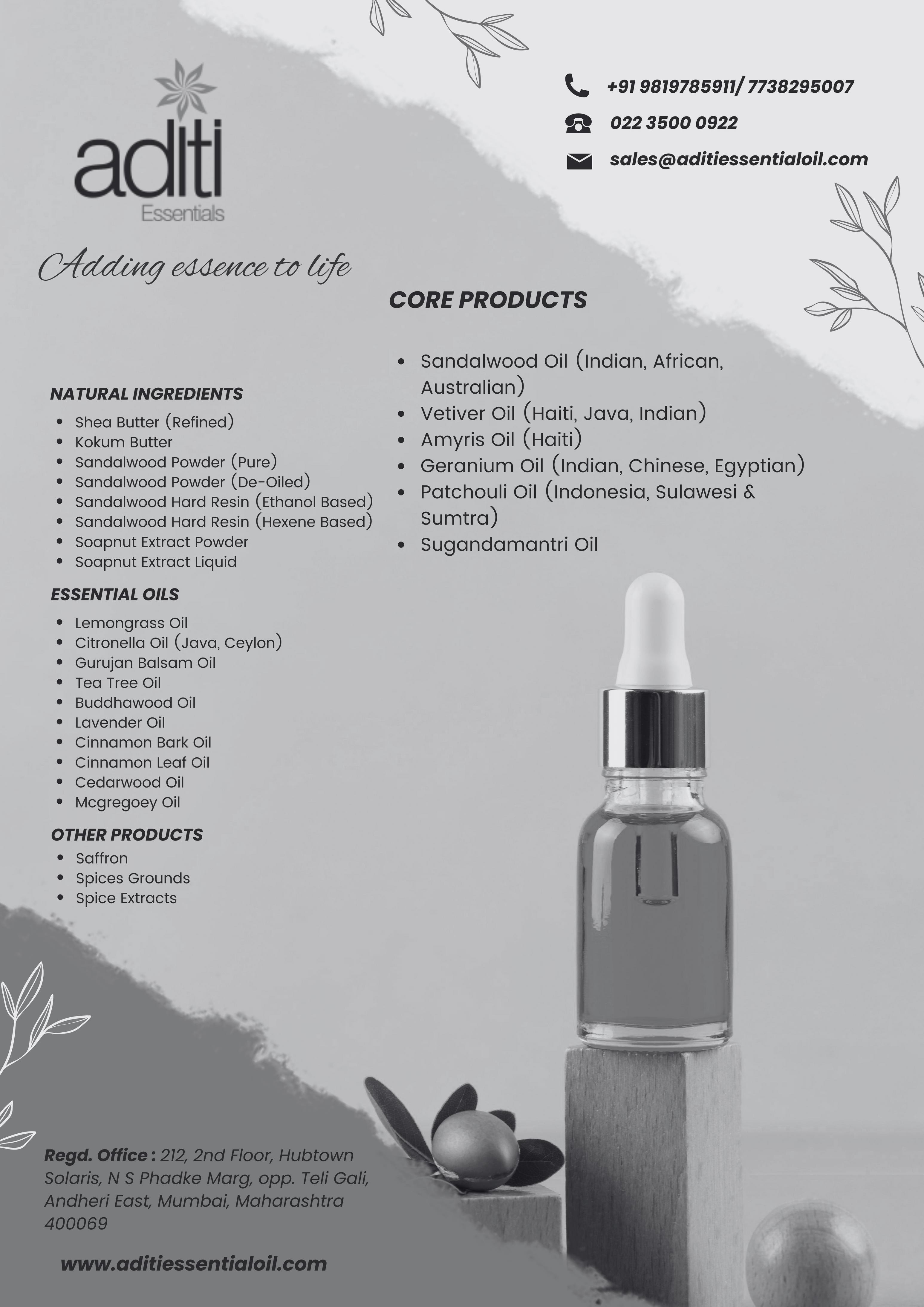 SOLLVVENT s of: r ACID DYES ACID RED 8 ACID YELLO ACID FIUOR l COOLAN YES CID D T & A Ph: 9825043630 i (W), Mumbai-400103. @gmail.com 7 (Eosin) W 73 (Uranine) ESCEIN NT DYES . L PVT L T. LTTD Blue l Y Yeellow l Pink l Orange Factory: A-2/4006, G.I.D.C. Industrial Ar O : 910, 9th sar , T Floorr, Teechno IT Park Ek r, , Link Rd Mobile: 9820836201 / 9820836209 l and other variable shades Purple l BROWN l PINK ANMOL COLORANT ea, Ankleshwar – 393 002. l d.,Next to Eskay Resort, Borival Email : mail.anmolchemicals S GLOBA Green l Red l For product list: Please visit us on www.adityamint.com Email: info@adityamint.com / adityamint07@gmail.com Contact: +91 8788521585 / 9970313727 / 9320208033 ADITYA MINT Address: F 63,First floor, The Zone Mall, Chandavarkar Road, Borivali West, Mumbai 400092. Factory: Dewa, Barabanki, U ar Pradesh. MENTHOL, THYMOL, CAMPHOR Lemongrass oil, Benzyl alcohol Essen al Oils, Herbal Oils, Carrier Oils and Fragrances C-501,5thFloor,JyotiPlaza,S.V.Road,Opp.AnandAshram,Kandivli(W),Mumbai–400067.