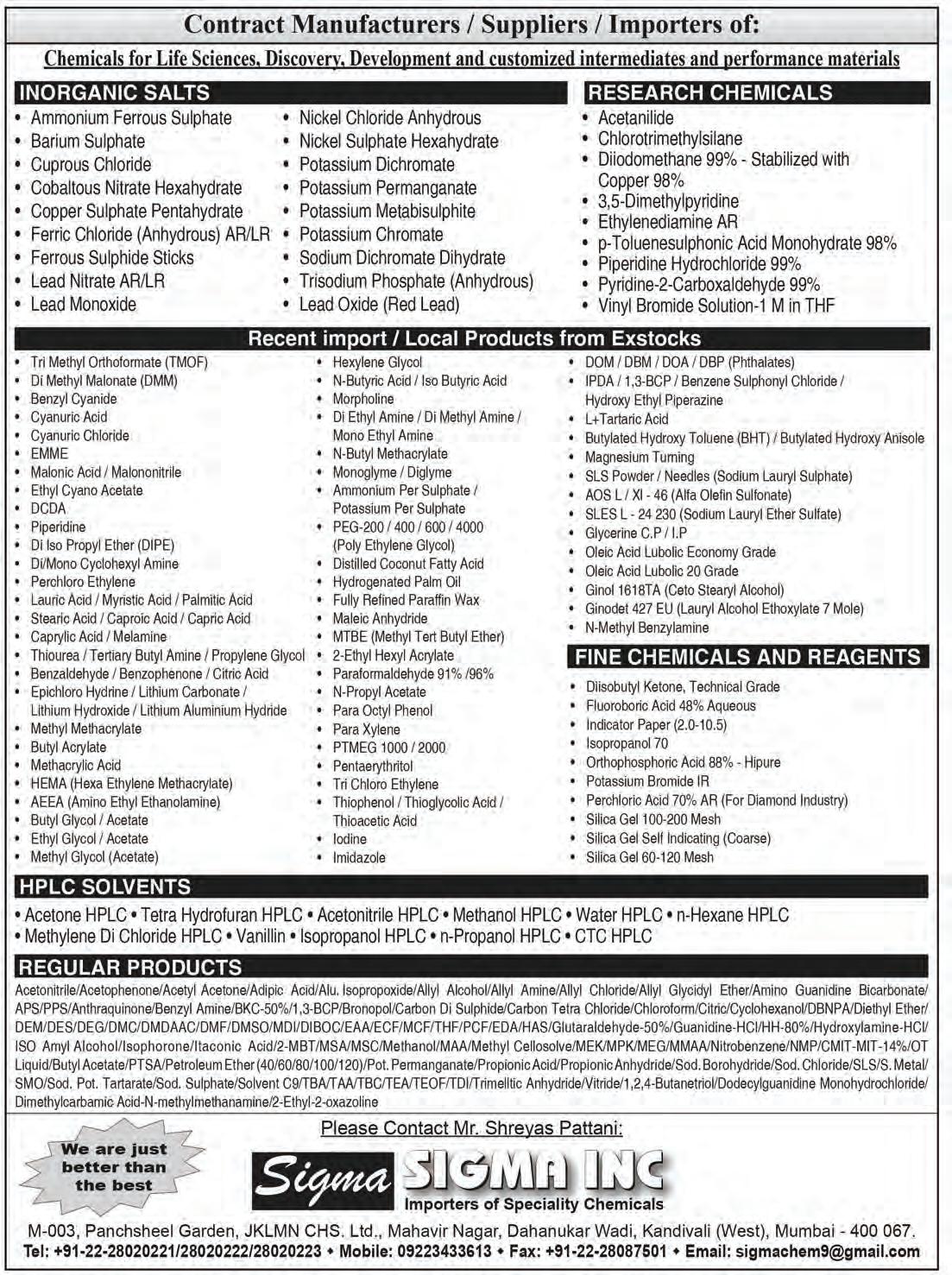 Parameters) PharmacopeiaGradeSolvents(USP) ReferenceListedDrugs(RLD)Products ContactDetails: (+91)9028240944 Email:sales@syrohchem.com Website:www.syrohchem.com 1,4 - Butanediol Acetic Acid Acetophenone Acrylic Acid Acrylonitrile Adipic Acid Benzoic Acid Bisphenol A Butyl Acrylate Butyl Carbitol Butyl Carbitol Acetate Butyl Cellosolve Butyl Cellosolve Acetate DEG Diethanolamine Dimethyl Formamide Dimethyl Sulfoxide Epichlorohydrin Ethyl Acetate Ethyl Carbitol Ethyl Cellosolve Ethyl Cellosolve Acetate Hexamine Isobutanol Maleic Anhydride MDI MEG Methacrylic Acid Methoxy Propanol Methoxy Propyl Acetate Methyl Carbitol Methyl Cellosolve Methyl Methacrylate Mix Xylene Monoethanolamine PEG 200/400/600/6000 PPG 400/1000/2000 Propylene Glycol PTMEG 1000/2000 TEG THF Toluene Triethanolamine Vinyl Acetate PRODUCT LIST 98200 34250