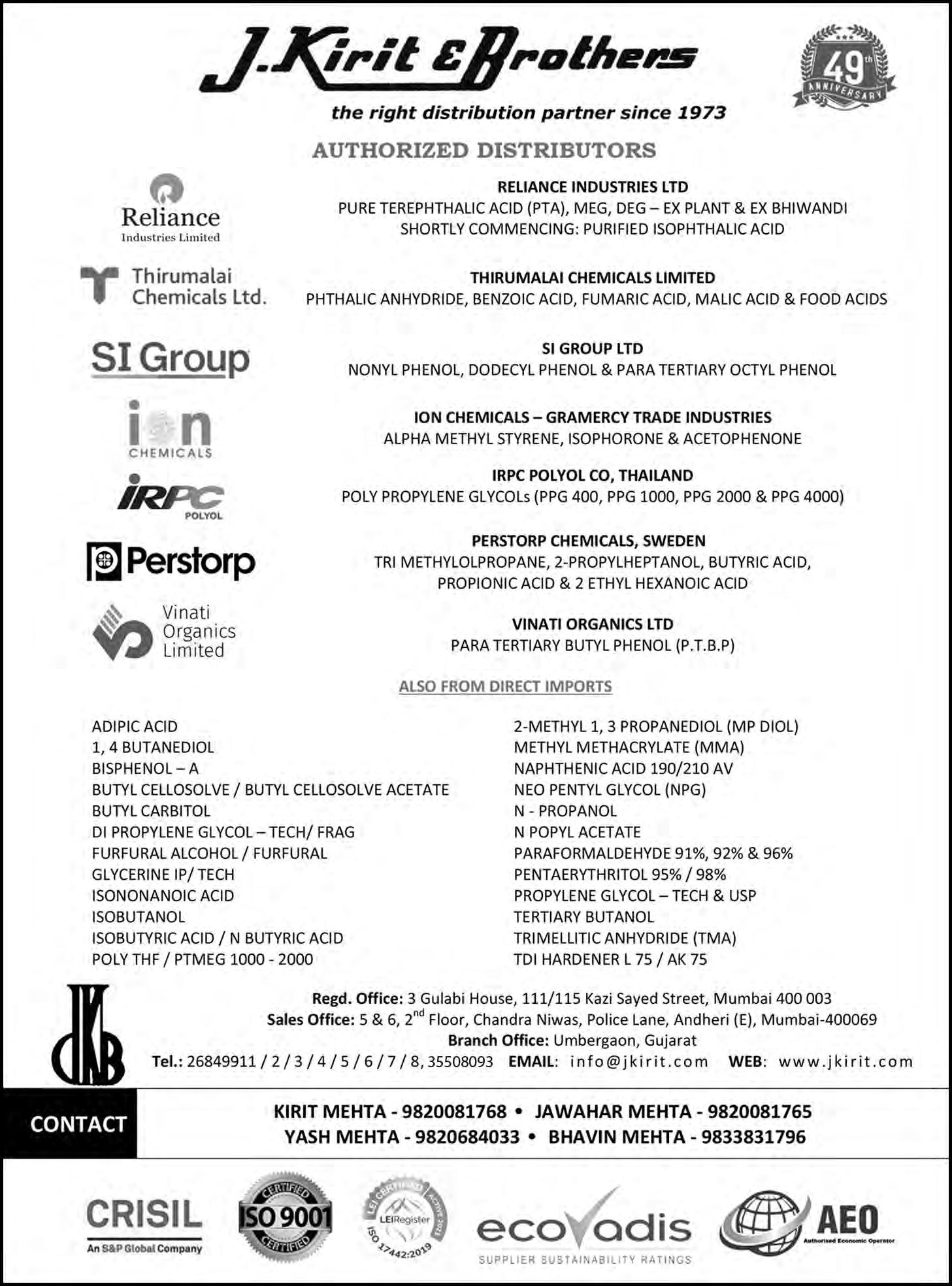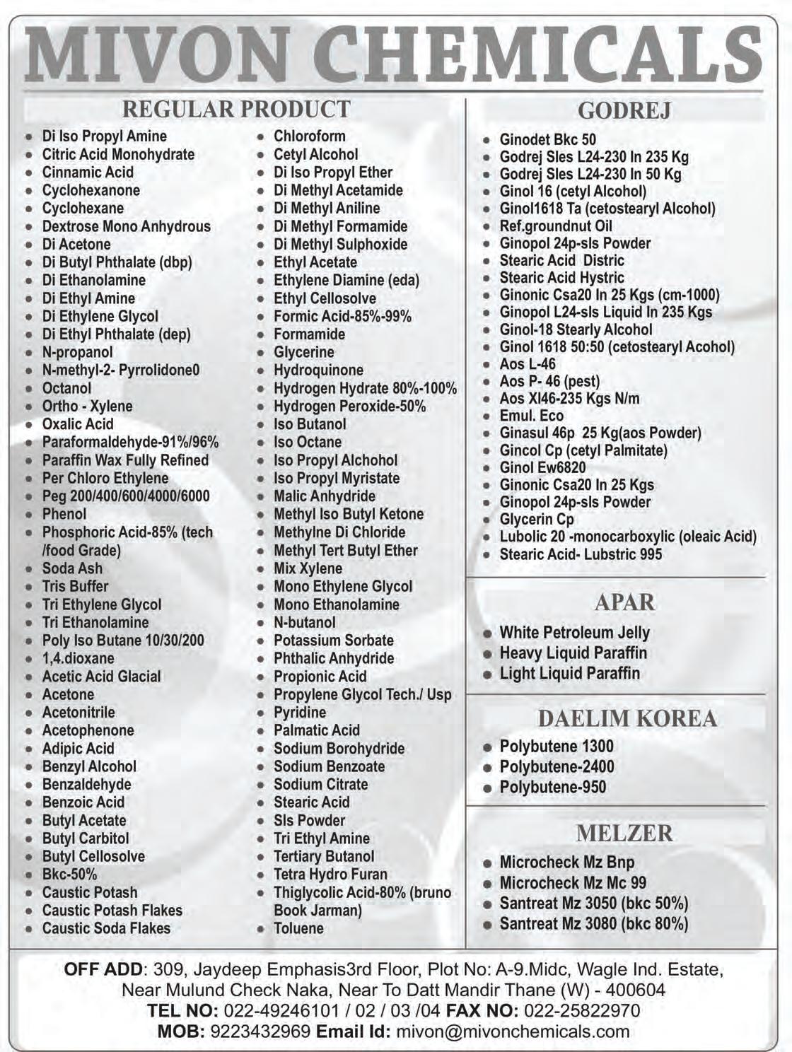 145Chemical Sourcing Guide AMIZARASPECIALITYCHEMICALSLLP CorporateOffice: A-301,3rdFloor,BorivaliArunodayaChsLtd.,MarketLane,AboveKhatavHospital,Borivali, Mumbai-400092. Tel: 022-67251313/67411313/28917600l Telefax: 022-28927600 ContactPerson:PARESHSHAH: 9820120703/9223432851, RASHMINHARIA: 8779003699/9819320703 Email: info@amizaraspeciality.com/sales@amizaraspecialitychemicals.co.in