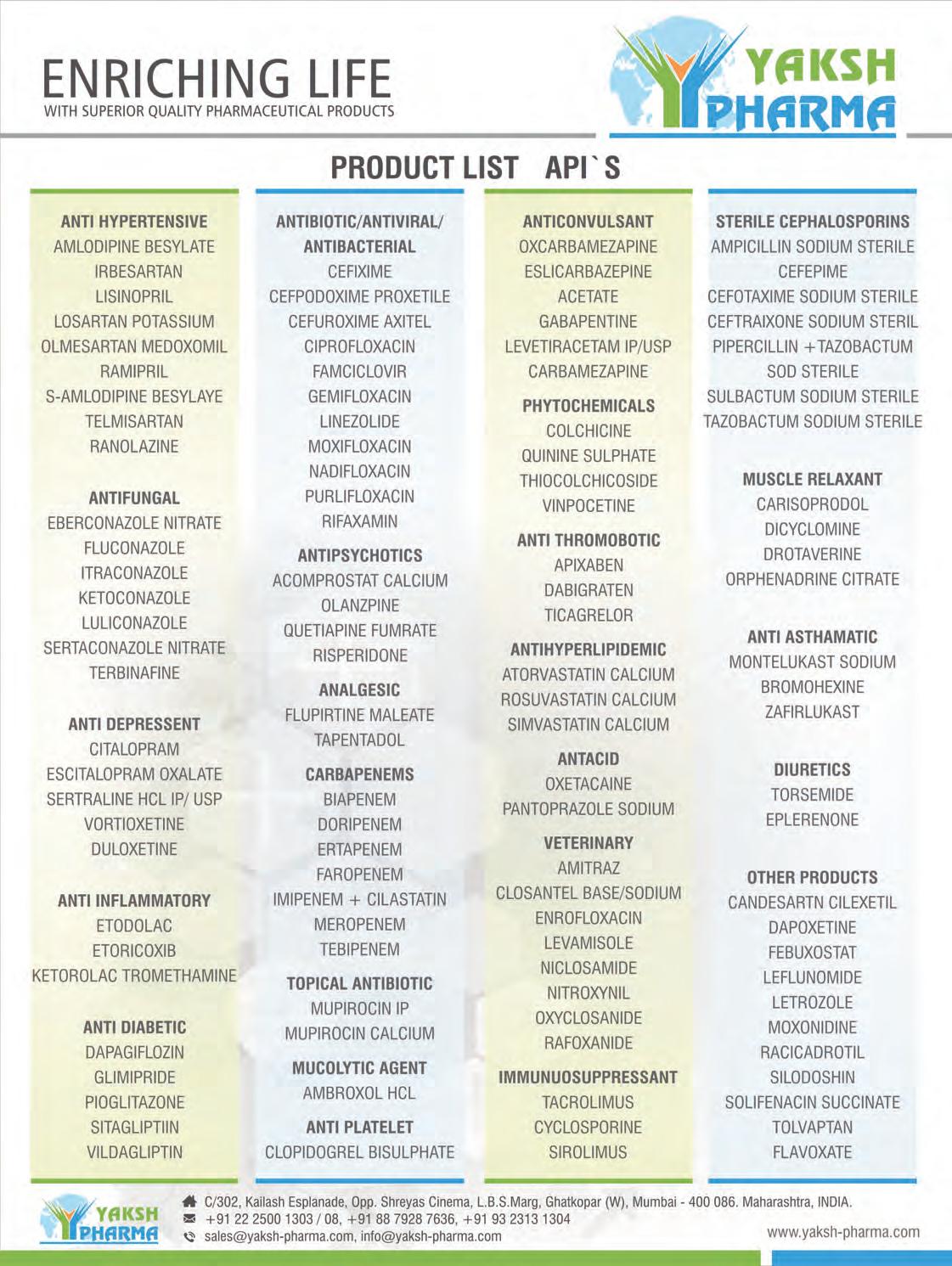 v ALFACALCIDOL IP / BP / USP v BECLOMETHASON DI PROPUNATE IP v BETAMETHASON PLAIN IP v BETAMETHASON SODIUM IP v BIMATO PROST v CALCIPOTRIN MONOHYDRATE IP / BP / USP v CALCITRIOL IP / BP / USP v CARBO PROST v CLOBETASOL BUTRATE IP v CLOBETASOL PROPUNATE IP / USP v DEFLAZACORT IH v DI ETHYALSTILLBASE STROL USP / IP v DIGOXIN USP v DUTASTRIDE IP v FLUCINOLON ACETONIDE IP v FOLIC ACID IP v HRDROCOTISONE BASE IP v HYDROCOTISONE ACETATE IP v HYDROXY COBALAMINE IP / BP v ISOTRETINION IP v LATANO PROST v LEVONORGESTROL IP v LUMEFANTRINE USP v METHOTRAXATE IP v METHYAL COBALAMINE IP / JP v METHYAL PREDNISOLONE IP v MISOPRISTOL 1% HPMC v MOMANTASON FUROATE IP v NANDROLONE DECONATE IP v NANDROLONE PHENYAL PROPUNATE IP v NORETHISTRONE IP v POLYMIXINE B SULPHATE v PREDNISOLONE IP v REBOFLAVINE FEED / IP v ROSUVASTATIN CALCIUM IP v STANAZOLOL v THIOCOLCHICOSIDE IP v TOBRAMYCINE SULPHATE USP v TRIMICELONE ACETONITE IP v TRTINION IP v VITAMIN B 12 v VITAMINE D2 IP v ZINC BACITRACIN 40/60 IP B-606,Canara BusinessCentre, Behind Everest Garden, Laxmi Nagar, Ghatkopar (East), Mumbai-400075. Mob :- 9322247051/850586812 Email :- vp123sd@rediffmail.com, vp123sd@gmail.com WE HAVE SHIFTED