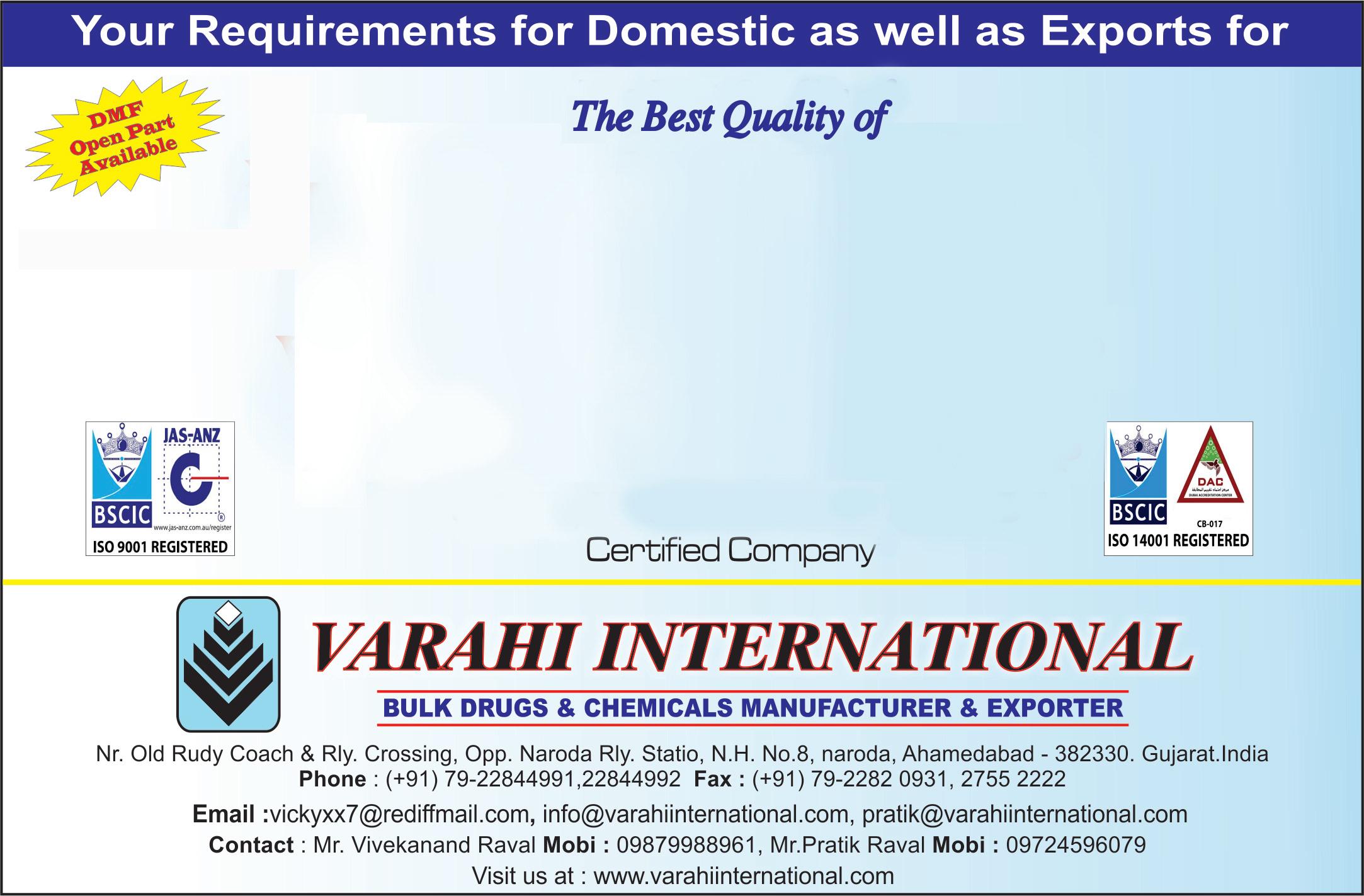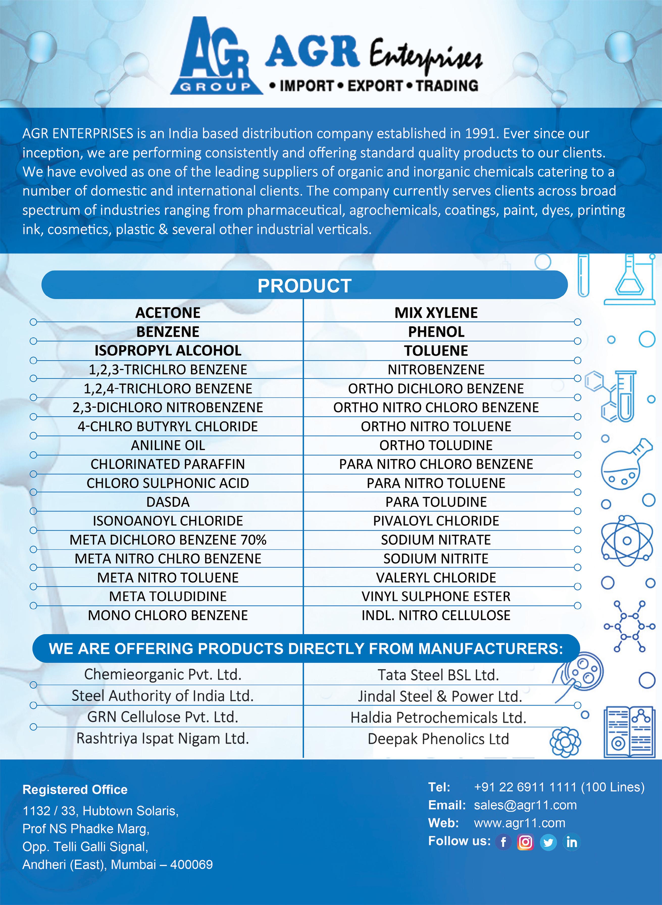 3 AARA PHARMA 73 AD PHARMACHEM PVT LTD 40 ADI METCHEM PRIVATE LIMTED 24 ADITI ESSENTIALS 15 ADITYA MINT 78 AGR ENTERPRISES 83 AKSHAR CHEMICALS INDIA PVT LTD 54 AMI CHEM 17 AMIT HYDROCOLLOIDS 22 AMNEM 80 AMPTECH INDIA HARIDWAR FEB 2024 36 AMRUT ENTERPRISES 39 AMRYS IPR SERVICES 72 ARIL PAHRMACEUTICALS 58 ARJUNE BEES WAX INDUSTRIES 12 ARK CHEMICALS PVT LTD 35 ARNISH LABORATES PVT. LTD. 71 ASHAPURA INTERMEDIA 81 ASIA LABEX 33 ASIEL CHEMPHARMA 27 ASTER BIOPHARMA LLP 18 AVI SCIENTIFICS 67 AYON PHRMACHEM 67 AZEOCRYST ORGANICS PVT LTD BACK INSIDE FLAP B.J.SCIENTIFIC CO 42 B.SHAH & SONS 47 BAKUL AROMATICS AND CHEMICALS PVT LTD 13 BALAJI CORPORATION 49 BALAJI STEROIDS AND HORMONES PVT LTD 31 BIOTECH SOLOUTIONS & PHARMACEUTICALS LIMITED 21 BLUETECH MEDIA 81 BOMBAY ENGINEERING WORKS 70 BULAT PHARMACEUTICALS PVT LTD 21 BUMPER OFFER RATE CARD 82 C R PHARMA 49 CHEMICAL PROCESS CONSULTANT 32 CHEMIMAN 76 CHEMINO PHARMA LTD 20 CHEMKART 14 CHEMSTAR GLOBAL PRODUTS LLP 54 COSMIC CHEMICALS 29 CROMA CHEMICAL CORPORATION 56 CRYSTAL PHARMA 76 DEEPA PHARMA 70 DEV INTERNATIONAL 39 DIRECTORY SALES ADVT 79 DPB PHARMACEUTICALS LTD FRONT FLAP EARTH CHEMICAL & SCIENTIFIC PVT LTD 18 ESKAY IODINE PRIVATE LIMITED 26 FILTROMIX EQUIPMENTS LLP 30 FLORA DYECHEM 74 FORBES PHARMACEUTICALS 25 G.M.CHEMIE PVT LTD 24 GANDHI CHEMICALS 69 GBL CHEMICAL LIMITED 10 GLOBAL MERCHANTS 68 HAP ENTERPRISE 23 HELIX MULTICHEM 51 HITEN PHARMA CHEM 43 HRITIK CHEMICALS PVT. LTD. 80 INDIA LAB EXPO 37 INDIA PHARMA EXPO HYDERABAD 65 INDIAN PLATINUM PVT LTD 35 INFOZEN INDIA ENTERPRISE 66 INTEGRATED PROJECT MANAGMENT SERVICES 68 INTENATIONAL DRUG & CHEMICALS CO 40 IRIS INGREDIENTS 2 JAKSON PHARMA 50 JAYANT AGRO ORGANICS LTD 58 JAYSUM BIOTECH 13 JEEVAN CHEMICALS AND PHARMACEUTICALS 55 JKW CHEMICALS PVT.LTD. 66 JPC AIR HANDLERS ENGINEERING 48 JUANA PHARMA 46 JYOTI GLOBAL PLAST PVT LTD 59 K.PATEL INTERNATIONAL 84 KAMLESH ENTERPRISES 53 KANCHAN RASAYAN 36 KEMS RAW PHARMA 55 KESAR CONTROL SYSTEMS 12 KESHARIYA CORPORATION , DEV PHARMACEUTICALS 79 KESHAV HICHEM PRIVATE LIMITED 9 KHUSHBU DYE CHEM PVT LTD 42 KIP CHEMICALS PVT. LTD. 70 KIRAN TRADERS 63 KRONOX LAB SCIENCES LIMITED 28 LABORATORY SOLUTIONS INDIA 19 LUCONIC CHEMICALS 78 M/S. ALBA ORGANICS 75 MALAY ENTERPRISE 61 MARUTI INDUSTRIES 45 MARUTI PETROCHEM 11 MEDISEARCH LAB (BOM) PVT LTD 78 MEHTECH ENGINEERING PVT. LTD. 69 MERU CHEMI PHARMA LTD 20 MIVON CHEMICALS 62 MODY CHEMI PHARMA LTD 32 NAKSHA PHARMA NUTRACITICAL PVT. LTD. 62 NALANDA RESEARCH LABORATORIES 71 NANDLAL BANKATLAL PVT LTD 1 NEHA ENTERPRISES85 77 NEHA PHARMA PVT.LTD. 65 NGL FINE CHEM LIMITED 28 NIKEON CORPORATION 63 NIRA LIFE SCIENCES PVT. LTD. 75 NISHA CHEMICALS 64 NITCO WATERTECH AND INDUSTRIAL CONCEPTS 72 NORTH INDIA PHARMA 57 NOV CHEMIE 38 OCEANIC LABORATORIES PVT LTD 25 OMKAR LOGISTIC 73 OXFORD LAB CHEM 46 P.G. SHAH & CO. 74 PACIFIC BIOCHEM PRIVATE LIMITED 14 PACIFIC ORGANICS PVT LIMITED 41 PANCHAMRUT CHEMICALS 41 PANCHSHEEL ORGANICS LIMITED 38 PARAS CHEM (INDIA) 77 PARESH CHEMCIALS INDUSTIRES 44 PARSHWA PHARMA CHEM 52 PAYAL IMPEX 72 PHARMA LIVE EXPO 2024 2 PHARMA PRO & PACK EXPO 2023 60 PHARMACUBORD 67 PHARMALAB CHEM EXPO 2023 (INDORE & VIZAG ) 31 POWDER PACK CHEM 77 PRAVINCHANDRA & CO 30 PROGRESS LIFE SCIENCE 34 PRUDENCE PHARMA CHEM FRONT INSIDE FLAP PYRAMID TECHNOPLAST PVT LTD 16 QUALIKEMS 52 RAJESH A. SHAH 78 RANGOLI PLASTICS PVT LTD 23 RASAYAN INDIA 45 RATI PUSHP INTERMEDIATES PVT LTD 27 REGAL REMEDIES LIMITED 51 RIDDHI SIDDHI DYE CHEM 68 ROLENCE PHARMA AND CHEMICALS LLP 67 ROSETTA LIFE CARE PRIVATE LIMITED 19 RUSKIN CHEMIPHARMA BACK FLAP RYCE YASH INDIA 74 S.A.I.PRODUCTS 73 SADHANA ENTERPRISES 59 SALICYLATES AND CHEMICALS PVT LTD 15 SANGRAM INDUSTRIES / CHEMLINK SOFTWAR 69 SANJAY ENTERPRISES 69 SDA PRODUTS 57 SHAGUN PHARMACEUTICALS 33 SHEETAL CHEM 47 SHRADDHA ANALYTICAL SERVICES 75 SHREEDHAR ENTERPRISES 73 SIDDHAMIBAK IMPEX 53 SIDDHARTH INTERNATIONAL 61 SIDDHIVINAYAK PHARMA 44 SIGMA CHEMICAL INDUSTRIES 70 SIGMA INC 43 SKY CHEM 50 SOHYOG LIFESCIENCRE 37 SRI PHARMACARE 74 STANDARDCON PVT LTD 56 SULPHUR MILLS LIMITED 68 SUNRAJ CHEMICAL CO. 76 SURYA LIFE SCIENCE LTD 22 SWAN ENTERPRISES 76 SYNCHROM LABORATORY PVT LTD 26 SYNTHETIC MOLECULES 60 SYROCHEM LABORATORIES PVT LTD 48 U.K. VET CHEM 75 UNIPHARMA 71 UNITRADE AGENCIES 29 VARAHI INTERNATIONAL 16 VIBGYOR CHEMICAL INDUSTRIES 72 VINIPUL INORGANICS PVT LTD 17 VISION PHARMA 34 VITA-MIN PROBIOTIC 71 YAKSH PHARMA 64 ZAMA CHEMICAL 77