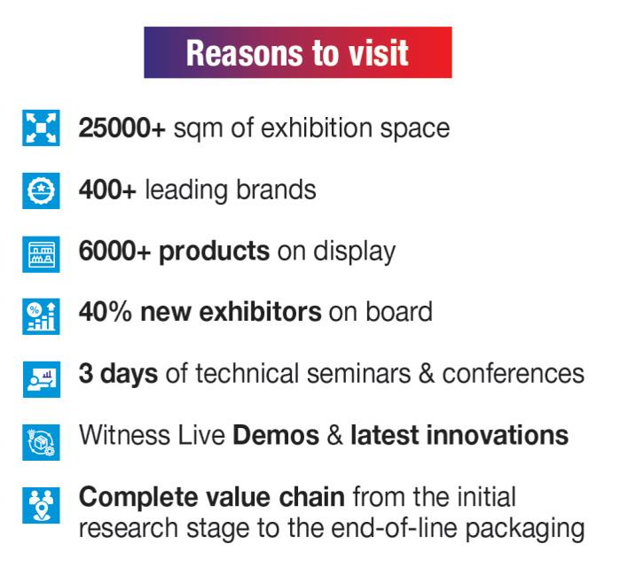 PURCHASE MANAGERS FROM PHARMA COMPANIES l PROCUREMENT OFFICIALS FROM RENOWNED HOSPITALS l PHARMACEUTICAL EXPORTERS l CEOS, R&D PROFESSIONALS l DOCTORS l REGULATORY OFFICERS l PHARMACISTS l EQUIPMENT SUPPLIERS & DISTRIBUTORS l SENIOR MANAGERS FROM PHARMACEUTICAL INDUSTRY l BIOTECHNOLOGY SPECIALISTS l HOSPITAL ADMINISTRATORS l ACADEMICIANS, TEACHERS & STUDENTS • POLICY MAKERS, DIPLOMATS & MORE 28 - 30 NOVEMBER 2023 INDIA EXPO CENTRE, GREATER NOIDA, DELHI NCR 14-15-16 DEC 2023 | INDORE INDORE LABH GANGA EXHIBITION CENTRE 16-17-18 FEBRUARY 2024 HARIDWAR, UTTARAKHAND
