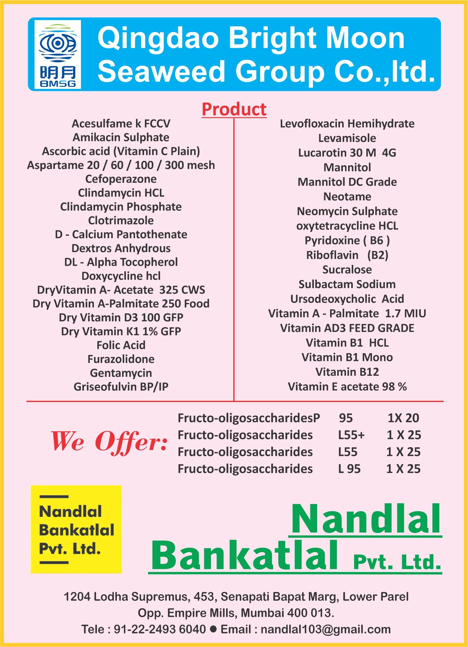 AARA PHARMA 81 AD PHARMACHEM PVT LTD 45 ADI METCHEM PRIVATE LIMTED 45 ADITI ESSENTIALS 29 ADITYA MINT 86 AGR ENTERPRISES 95 AKSHAR CHEMICALS INDIA PVT LTD 65 AMI CHEM 27 AMIT HYDROCOLLOIDS 41 AMNEM 88 AMRUT ENTERPRISES 36 AMRYS IPR SERVICES 81 APRA INNOVATIVE PVT LTD 23 AVI SCIENTIFIC (INDIA) 08 ARIL PAHRMACEUTICALS 59 ARK CHEMICALS PVT LTD 44 ARNISH LABORATES PVT. LTD. 83 ASIEL CHEMPHARMA 25 ASTER BIOPHARMA LLP 32 ASIA LABEX 2023 - GHANDINAGAR, GUJRAT 90 AYON PHARMACHEM 76 AZEOCRYST ORGANICS PVT. LTD. BACK INSIDE FLAP B.J.SCIENTIFIC CO 54 B.SHAH & SONS 56 BALAJI STEROIDS AND HORMONES PVT LTD 49 BALAJI CORPORATION 60 BAKUL AROMATICS AND CHEMICALS PVT. LTD. 06 BIOTECH SOLOUTIONS & PHARMACEUTICALS LIMITED 24 BOMBAY ENGINEERING WORKS 80 BULAT PHARMACEUTICALS PVT LTD 25 BUMPER OFFER RATE CARD 92 BLUETECH MEDIA 90 C R PHARMA 52 CHEMIMAN 83 CHEMINO PHARMA LTD 26 CHEMKART 27 CHEMLINK SOFTWARE 76 CHEMSTAR GLOBAL PRODUTS LLP 57 CHEMICAL PROCESS CONSULTANTS 87 COSMIC CHEMICALS 48 CROMA CHEMICAL CORPORATION 68 CRYSTAL PHARMA 82 DEEPA PHARMA 80 DEV INTERNATIONAL 42 DEV PHARMACEUTICALS 86 DPB PHARMACEUTICALS LTD. FRONT FLAP EARTH CHEMICAL & SCIENTIFIC PVT LTD 28 EMCO DYESTUFF PVT LTD 71 EMCO INGINEERING PVT. LTD. 75 ESKAY IODINE PRIVATE LIMITED 41 FLORA DYECHEM 84 FLTROMIX EQUIPMENTS LLP 34 FORBES PHARMACEUTICALS 33 G.M.CHEMIE PVT LTD 43 GANDHI CHEMICALS 78 GLOBAL MERCHANTS 76 HAP ENTERPRISE 36 HELIX MULTICHEM 61 HITEN PHARMA CHEM 46 HRITIK CHEMICALS PVT. LTD. 88 INDIAN PLATINUM PVT LTD 43 INFOZEN INDIA ENTERPRISE 20 INTEGRATED PROJECT MANAGMENT SERVICES 77 INTENATIONAL DRUG & CHEMICALS CO 47 INDIA LAB EXPO & PHARMA PRO & PACK EXPO 89 IRIS INGREDIENTS 2 J R DRUGCHEM PVT LTD 23 JAYANT AGRO ORGANICS LTD 66 JAYSUM BIOTECH 42 JEEVAN CHEMICALS AND PHARMACEUTICALS 56 JKW CHEMICALS PVT.LTD. 72 JPC AIR HANDLERS ENGINEERING 50 JUANA PHARMA 71 JYOTI GLOBAL PLAST PVT LTD 20 JAKSON PHARMA 75 K. PATEL INTERNATONAL 96 KAMLESH ENTERPRISES 46 KANCHAN RASAYAN 30 KEMS RAW PHARMA 60 KESHARIYA CORPORATION 86 KESHAV HICHEM PRIVATE LIMITED 19 KHUSHBU DYE CHEM PVT LTD 38 KIP CHEMICALS PVT. LTD. 78 KIRAN TRADERS 70 KRONOX LAB SCIENCES LIMITED 35 LABORATORY SOLUTIONS INDIA 35 LIFESCIENCE INTELLIPEDIA PVT. LTD. 87 LUCONIC CHEMICALS 86 M.K CHEMIE PHARMA 51 M/S. ALBA ORGANICS 85 MALAY ENTERPRISE 72 MARUTI INDUSTRIES 50 MARUTI PETROCHEM 21 MEHTECH ENGINEERING PVT. LTD. 78 MERU CHEMI PHARMA LTD 39 MEDISEARCH LAB (BOM) PVT LTD 91 MIVON CHEMICALS 69 MODY CHEMI PHARMA LTD 30 NAKSHA PHARMA NUTRACITICAL PVT. LTD. 70 NALANDA RESEARCH LABORATORIES 79 NANDLAL BANKATLAL PVT LTD 1 NEHA ENTERPRISES 85 NEHA PHARMA PVT.LTD. 68 NGL FINE CHEM LIMITED 44 NIRA LIFE SCIENCES PVT. LTD. 81 NISHA CHEMICALS 63 NISHCHEM INTERNATIONAL PVT LTD 64 NITCO WATERTECH AND INDUSTRIAL CONCEPTS 82 NIKEON CORPORATION 73 NORTH INDIA PHARMA 57 NOV CHEMIE 51 OCEANIC LABORATORIES PVT LTD 53 OMKAR LOGISTIC 82 OXFORD LAB CHEM 55 P.G. SHAH & CO. 80 PACIFIC ORGANICS PVT LIMITED 52 PANCHAMRUT CHEMICALS 47 PANCHSHEEL ORGANICS LIMITED 34 PARAS CHEM (INDIA) 84 PARESH CHEMCIALS INDUSTIRES 62 PAYAL IMPEX 81 PARSHWA PHARMA CHEM 74 PHARMAC SOUTH 2023 91 PHARMA LIVE EXPO 2024 2 PHARMA CUP BOARD 89 PHARMALAB CHEM EXPO 2023 (INDORE & PUNE) 59 POWDER PACK CHEM 83 PRAVINCHANDRA & CO 58 PROGRESS LIFE SCIENCE 39 PRUDENCE PHARMA CHEM FRONT INSIDE FLAP PYRAMID TECHNOPLAST PVT LTD 31 QUALIKEMS 73 RANGOLI PLASTICS PVT LTD 26 RASAYAN INDIA 63 RATI PUSHP INTERMEDIATES PVT LTD 24 RAJESH A. SHAH 91 REGAL REMEDIES LIMITED 55 RIDDHI SIDDHI DYE CHEM 77 ROSETTA LIFE CARE PRIVATE LIMITED 32 RYCE YASH INDIA 76 RUSKIN CHEMIPHARM BACK FLAP SDA PRODUTS 61 S.A.I.PRODUCTS 82 SADHANA ENTERPRISES 65 SALICYLATES AND CHEMICALS PVT LTD 29 SANJAY ENTERPRISES 77 SHAGUN PHARMACEUTICALS 37 SANGRAM INDUSTRIES 76 SULPHUR MILLS LIMITED 77 SHAH TC 33 SHEETAL CHEM 48 SHRADDHA ANALYTICAL SERVICES 85 SHREEDHAR ENTERPRISES 79 SIDDHAMIBAK IMPEX 53 SIDDHARTH INTERNATIONAL 67 SIGMA CHEMICAL INDUSTRIES 80 SIGMA INC 54 SIDDHIVINAYAK PHARMA 58 SKY CHEM 67 SOHYOG LIFESCIENCRE 37 SPECIAL SUPPLIMENT RATE CARD 94 SRI PHARMACARE 83 STANDARDCON PVT LTD 64 SUBSCRIPTION FORM CHEMICAL SOURCING GUIDE 93 SUBSCRIPTION FORM MAZDA PHARMA GUIDE 93 SUNRAJ CHEMICAL CO. 86 SURYA LIFE SCIENCE LTD 40 SWAN ENTERPRISES 84 SYNCHROM LABORATORY PVT LTD 40 SYNTHETIC MOLECULES 66 SYROCHEM LABORATORIES PVT LTD 38 U.K. VET CHEM 84 UNIPHARMA 79 UNITRADE AGENCIES 49 VARAHI INTERNATIONAL 31 VIBGYOR CHEMICAL INDUSTRIES 78 VINIPUL INORGANICS PVT LTD 28 VISION PHARMA 69 VITA-MIN PROBIOTIC 79 VITRO PHARMA MACHINERY 22 YEVE CHEMICALS INDUSTRIES 62 YAKSH PHARMA 74 ZAMA CHEMICAL 85 03 ADVERTISING INDEX COMPANY NAME PAGE NO. COMPANY NAME PAGE NO.