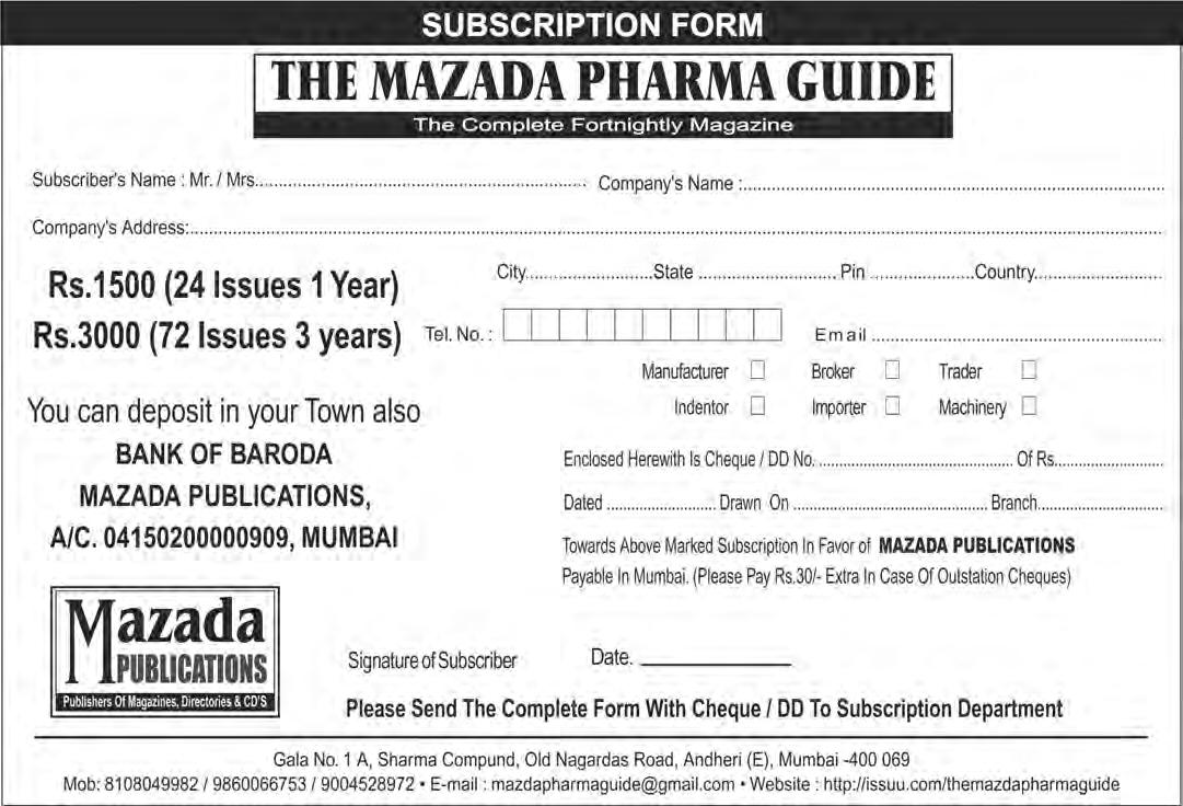 16 September- 30 September 2022 Vol.11 Issue 18, Pages 208 LORNOXICAM INH ETHYL OLEATE IP/BP/USP SUCRALFATE USP With GMP and DMF For More Products Please Visit Page No. 29 marketing@progresslifesciences.com +91 22 4978 1414 Manufacturer and Exporter of P PR RO OG GR RE ES SS S LI IFFE E S SCCIIEENNCCEES S P PVVT T L LT TD ARIHEET PHARMACHEM LLP V VITAMIN C I I P AASP P A AR TTAAME C CLOM M IPHENNE C CITTRAATTE IP MINNOOXI I DIL USSP Partner : Kevin Doshi Mob No: +91 9022243743 / 7021299060 Email Id: kevin@ariheetpharma.Com Website: www.ariheetpharma.Com Ready Stock Ex Bhiwandi MANUFACTURING PRODUCT All Products Comply to BP / USP / EP / IP / JP ANTI BACTERIAL Azithromycin Dihydrate Azithromycin Monohydrate Azithromycin (Bitterless) Chloramphenicol Chloramphenicol (Micronised & Sterile) Chloramphenicol Palmitate Clarithromycin Erythromycin Base Erythromycin Estolate Erythromycin Ethyl Succinate Erythromycin Propionate Erythromycin Phosphate Erythromycin Stearate LOCAL ANAESTHETICS Articaine Bupivacaine HCL Prilocaine Base & HCL Ropivacaine Base & HCL ANTI EMETIC Prochlorperazine Maleate Prochlorperazine Mesylate Granisetron ANTI DEPRESSANT Amoxapine ANTI HISTAMINE Promethazine Theoclate NON-STEROIDAL, ANTI INFLAMMATORY DRUG Tolfenamic Acid ANTI PRURITIC Calamine THERAPEUTIC AGENT Maleic Acid INTERMEDIATES Des Azithromycin (Aza Amine) For Azithromycin Erythromycin A Oxime Base For Macrolides TRADING PRODUCTS Evening Primrose Oil Borage Oil 313/314, Janki Centre, Plot No. 29, Shah Indl. Estate, Off. Veera Desai Road, Andheri (W), Mumbai-400 053. India. E-mail:chetan@mehtapharma.com E-mail:atul@mehtapharma.com Mob.: 0091-8390068777 Mob.: 0091-9821227077 Skype lD: csm.mpi Skype lD: asm.mpi Website: www.mehtapharma.com HORMONAL DRUG Melatonin For Products Please Refer Page No. 107 PROCHLORPERAZINE MALEATE IP/BP/USP DOXYLAMINE SUCCINATE USP GLICLAZIDE IP/BP DOMPERIDONE IP Mobile:- +91 9324211958, +91 9022445757 Email:- sales.crpharma@gmail.com Website:- www.crpharma.co.in CR PHAR R MA A Proprietor: Chintan Domadia www.mazadapharmaguide.com 108-110 PRUDENCE PHARMA CHEM – Ankleshwar sales@prudencepharma.com 0091-2646-222825 Cell No: + 91-9825205460 / 9624042444 MANUFACTURER & EXPORTER OF l l Glimepiride l Pirfenidone l Torsemide l l Silodosin l l Glibenclamide l Celecoxib ll Amlodipine Besilate l l Levamlodipine ll Etoricoxib l Febuxostat l Deferasirox l Memantine l Phenylephrine ll Rivaroxaban