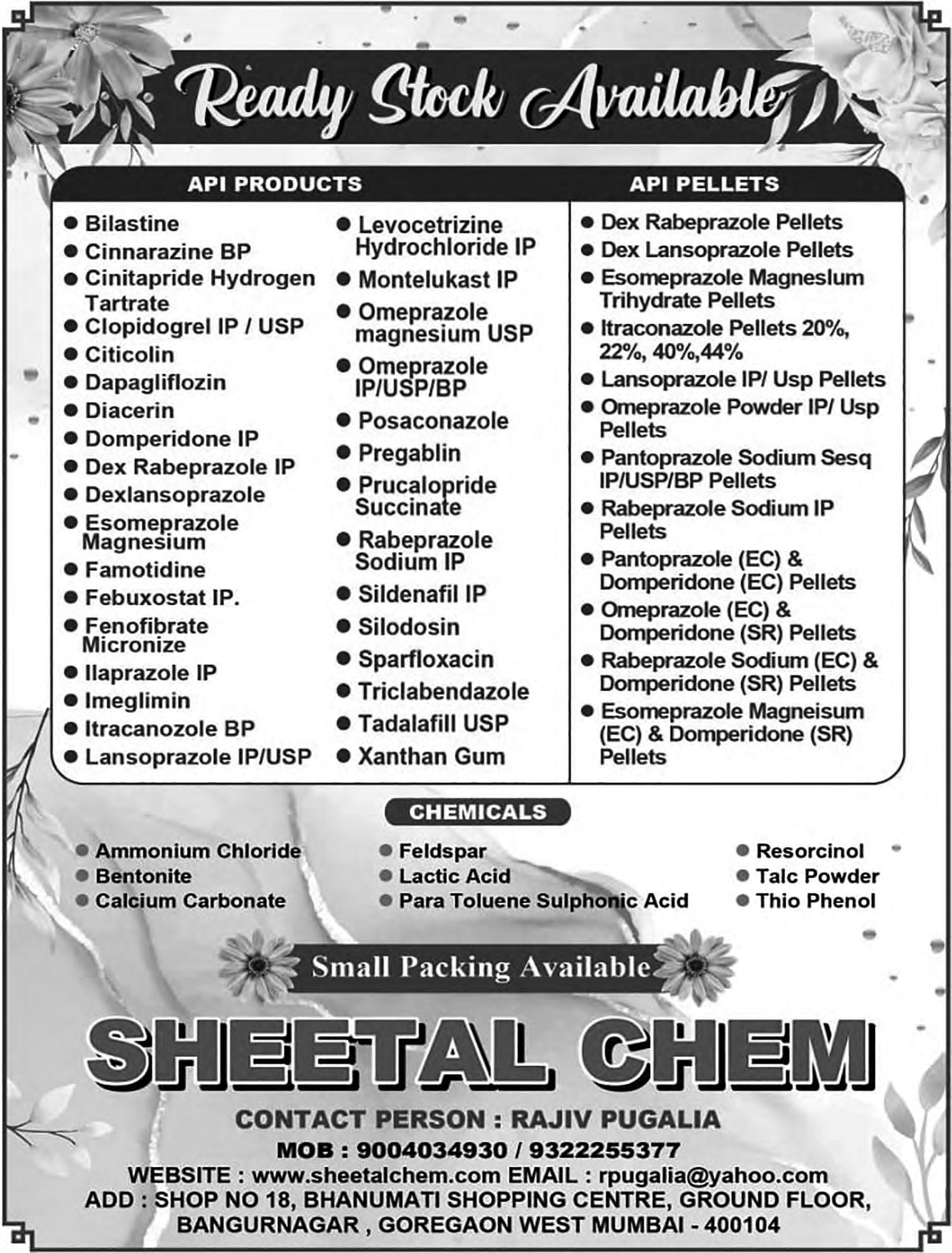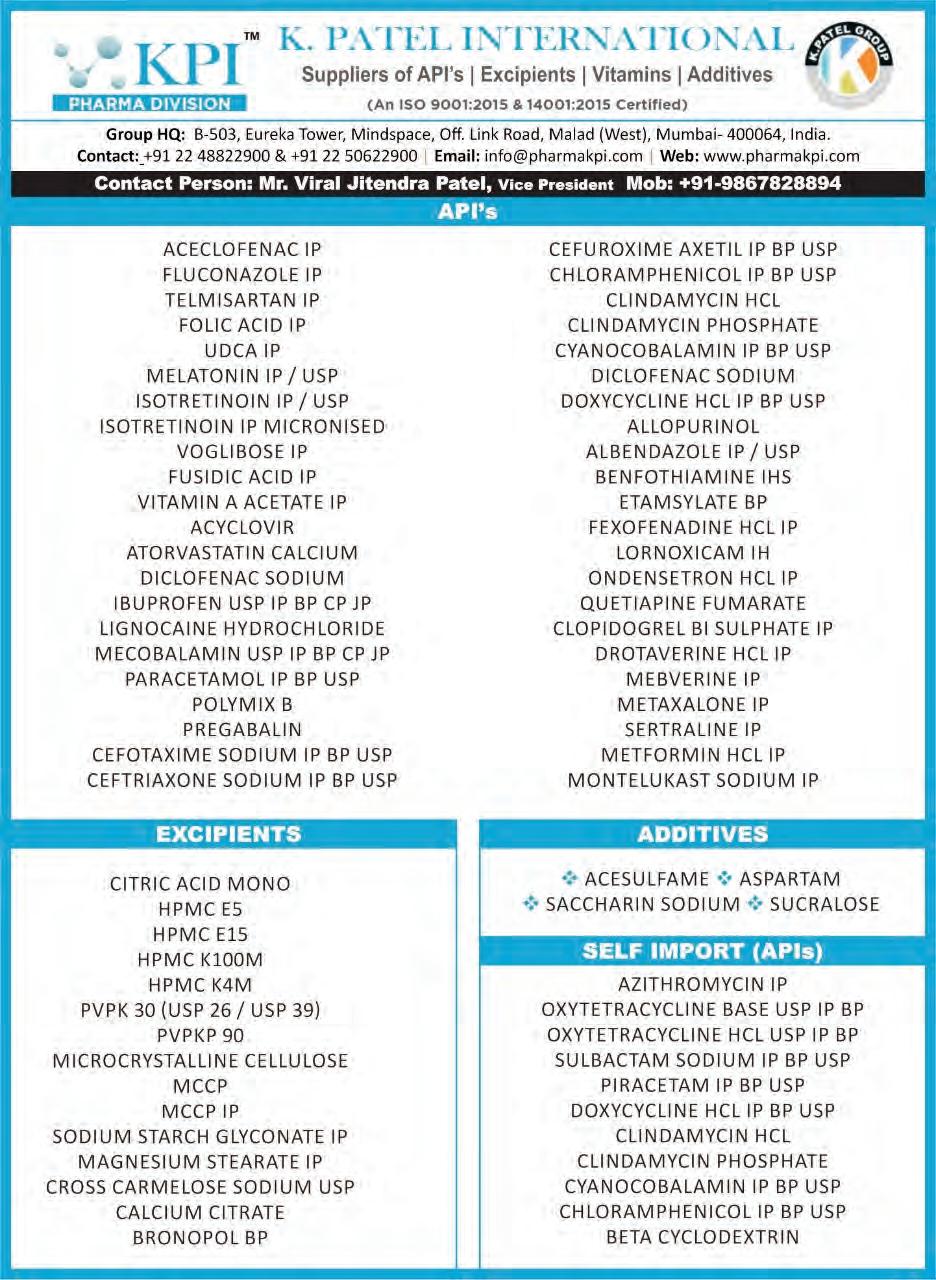 16 December - 31 December 2022 Vol.11 Issue 24, Pages 208 LORNOXICAM INH ETHYL OLEATE IP/BP/USP SUCRALFATE USP With GMP and DMF For More Products Please Visit Page No. 29 marketing@progresslifesciences.com +91 22 4978 1414 Manufacturer and Exporter of P PR RO OG GR RE ES SS S LI IFFE E S SCCIIEENNCCEES S P PVVT T L LT TD ARIHEET PHARMACHEM LLP V VITAMIN C I I P AASP P A AR TTAAME C CLOM M IPHENNE C CITTRAATTE IP MINNOOXI I DIL USSP Partner : Kevin Doshi Mob No: +91 9022243743 / 7021299060 Email Id: kevin@ariheetpharma.Com Website: www.ariheetpharma.Com Ready Stock Ex Bhiwandi M M ANUFAACTU U RINNG PRRODUUCCT T All Products Comply to BP / USP / EP / IP / JP ANTI BACTERIAL v Azithromycin Dihydrate v Azithromycin Monohydrate v Azithromycin (Bitterless) v Chloramphenicol v Chloramphenicol (Micronised & Sterile) v Chloramphenicol Palmitate v Clarithromycin v Erythromycin Base v Erythromycin Estolate v Erythromycin Ethyl Succinate v Erythromycin Stearate ANTISEPTIC v Chlorhexidine Gluconate 20% Solution ANTI DEPRESSANT v Amoxapine NUTRACEUTICAL ALPHA KETOANALOGUE v Leucine Calcium Salt v Isoeucine Calcium Salt v Valine Calcium Salt v Phenylalanine Calcium Salt v Methionine Calcium Salt ANTI EMETIC v Prochlorperazine Maleate v Prochlorperazine Mesylate v Granisetron ONCOLOGY v Abiraterone Acetate IP / USP MUSCLE RELAXANT v Metaxalone USP ANTI HISTAMINE v Promethazine Theoclate NON-STEROIDAL, ANTI INFLAMMATORY DRUG v Tolfenamic Acid ANTI PRURITIC v Calamine THERAPEUTIC AGENT v Maleic Acid INTERMEDIATES v Des Azithromycin (Aza Amine) For Azithr omycin v Erythromycin A Oxime Base For Macr olides 313/314, Janki Centre, Plot No. 29, Shah Indl. Estate, Off. Veera Desai Road, Andheri (W), Mumbai-400 053. India. E-mail:chetan@mehtapharma.com E-mail:atul@mehtapharma.com Mob.: 0091-8390068777 Mob.: 0091-9821227077 Skype lD: csm.mpi Skype lD: asm.mpi Website: www.mehtapharma.com HORMONAL DRUG Melatonin For Products Please Refer Page No. 107 PROCHLORPERAZINE MALEATE IP/BP/USP DOXYLAMINE SUCCINATE USP GLICLAZIDE IP/BP DOMPERIDONE IP Mobile:- +91 9324211958, +91 9022445757 Email:- sales.crpharma@gmail.com Website:- www.crpharma.co.in CR PHAR R MA A Proprietor: Chintan Domadia www.mazadapharmaguide.com PRUDENCE PHARMA CHEM – Ankleshwar sales@prudencepharma.com 0091-2646-222825 Cell No: + 91-9825205460 / 9624042444 MANUFACTURER & EXPORTER OF l l Glimepiride l Pirfenidone l Torsemide l l Silodosin l l Glibenclamide l Celecoxib ll Amlodipine Besilate l l Levamlodipine ll Etoricoxib l Febuxostat l Deferasirox l Memantine l Phenylephrine ll Rivaroxaban FORMULATERS PRODUCT PROFILE: 108 - 110