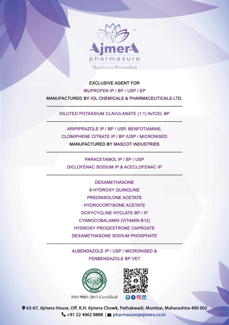Acesulfame k FCCV 25kg Anhui Jinhe Alpha Lipoic Acid 25kg Tohope Ascorbic Acid (Vitamin C Plain) 25kg Shandong Luwei / CSPC Aspartame 20 / 60 / 100 / 300 25kg Sinosweet / G. Sweet Mesh / Granuler Azithromycin 25lg Dongfeng / Guobang Caffine Anhydrous 25kg Cspc Ciprofloxacin 25kg Aarti Cyanocobalamin (Vit B12) 100Gms/1Kg Kingvit / Hebei Huarong D-Calcium Pantothenate 20/25Kg BASF DL-Alpha Tocopherol 5Kg BASF Doxycycline Hcl 25 Kg Hebei Dongfeng DryVitamin A-Acetate 500 CWS 1Kg Piramal DryVitamin A-Acetate 325 CWS 25Kg BASF Dry Vitamin D3 100 GFP 25Kg BASF FOS L55 25Kg Tata Chemical FOS L55+ 25Kg Tata Chemical FOS L95 25Kg Tata Chemical FOS P95 20Kg Tata Chemical Griseofulvin 20Kg Inner Mongolia PRODUCT PKG. MAKE Levamisole Hcl 25Kg Guilin Levofloxacin Hemihydrate 25Kg Shanghyu Jingxin