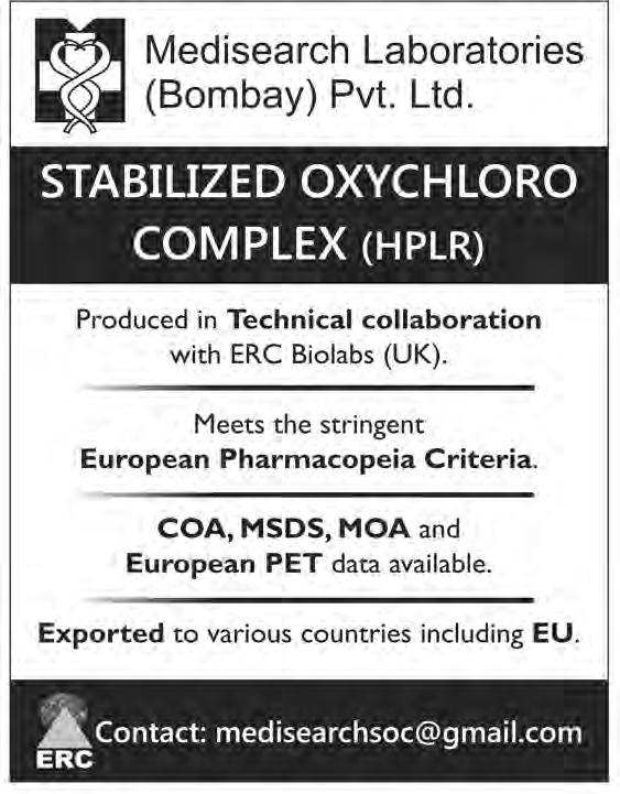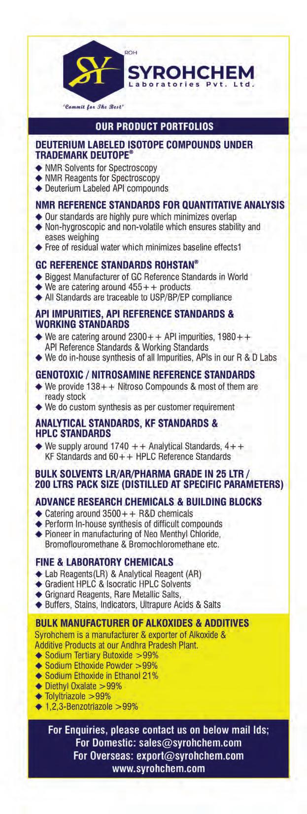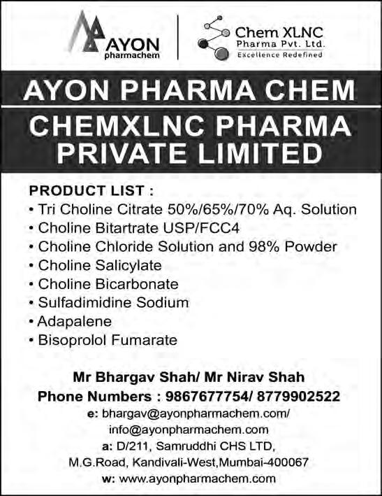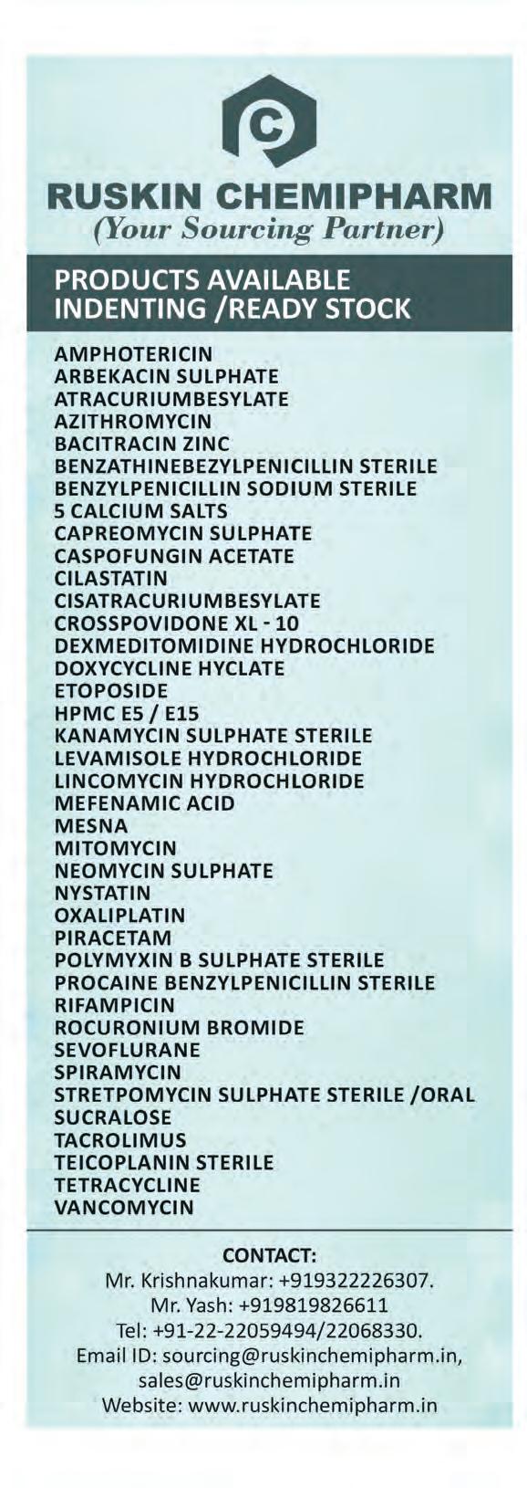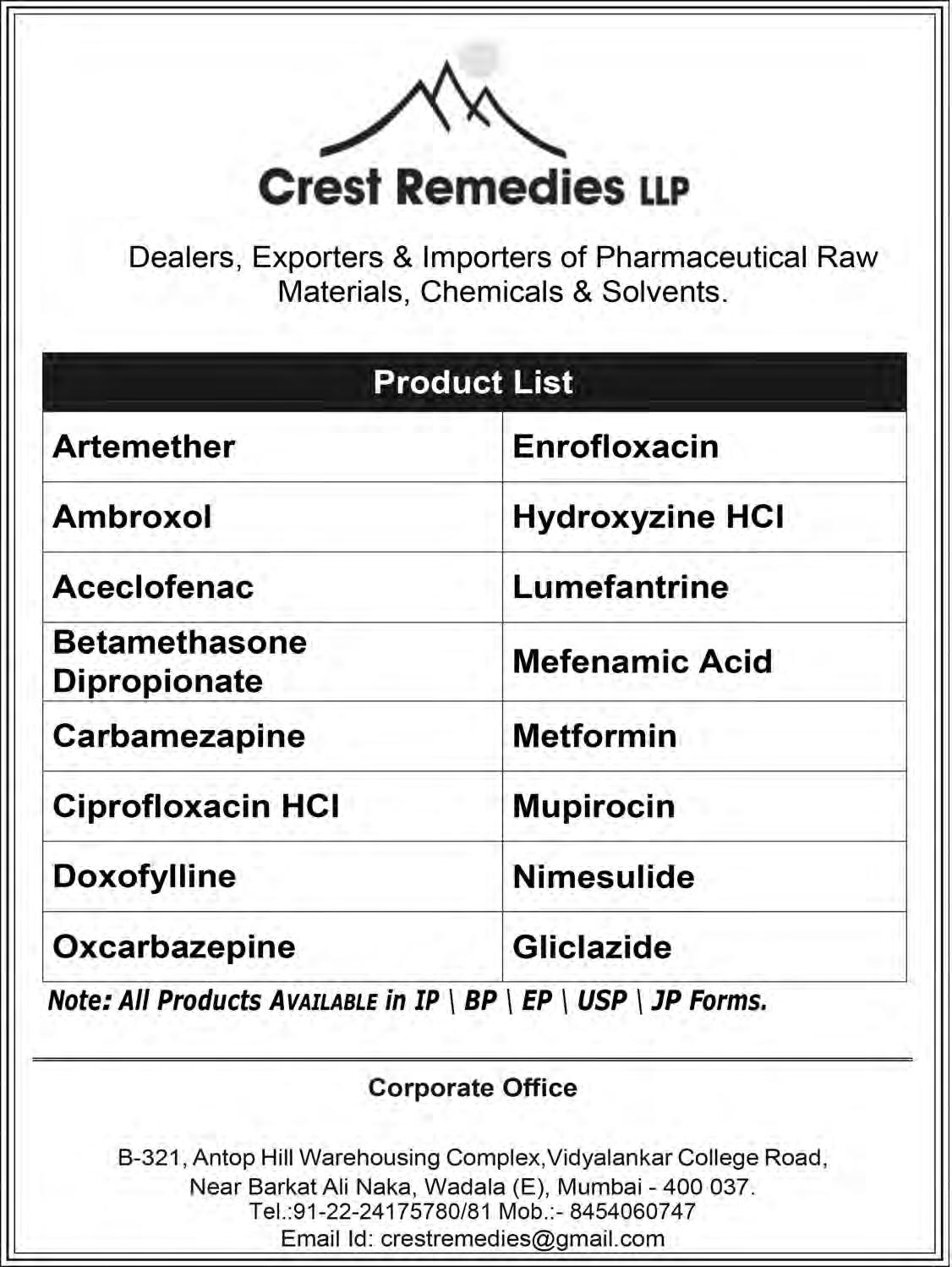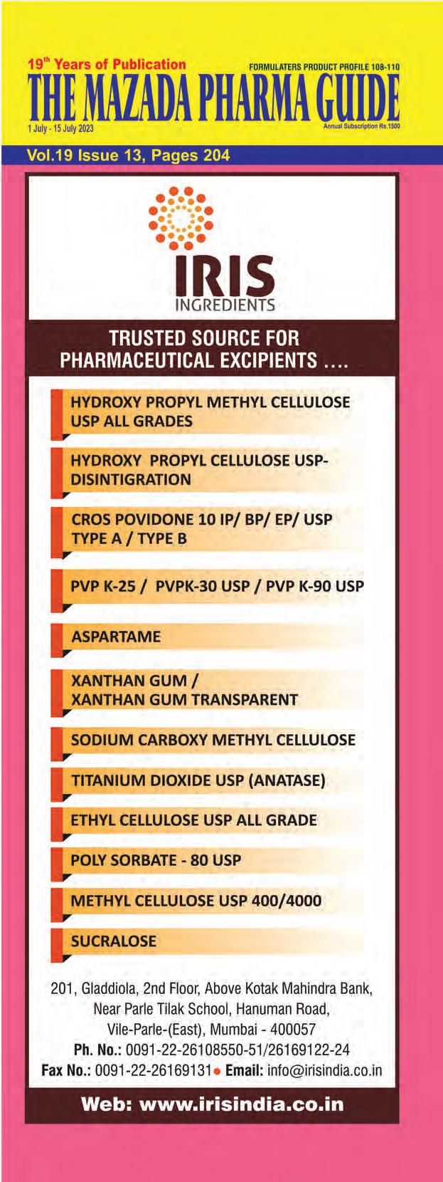 Vol.19 Issue 13, Pages 204 Manufacturing & Exporting Superior Quality Precious Metal Chemicals, Compounds of Rhodium, Gold, Silver, Palladium, Platinum, Iridium, Osmium, Ruthenium, Indium, Bismuth, Molybdenum Etc. INdIAN PlATiNUM PVT. LTd. Email: indianplatinum@gmail.com For Product Refer Page No. 158 LORNOXICAM INH ETHYL OLEATE IP/BP/USP SUCRALFATE USP With GMP and DMF For More Products Please Visit Page No. 29 marketing@progresslifesciences.com +91 22 4978 1414 Manufacturer and Exporter of P PR RO OG GR RE ES SS S LI IFFE E S SCCIIEENNCCEES S P PVVT T L LT TD www.mazadapharmaguide.com 1 July - 15 July 2023 PRUDENCE PHARMA CHEM – Ankleshwar sales@prudencepharma.com 0091-2646-222825 Cell No: + 91-9825205460 / 9624042444 MANUFACTURER & EXPORTER OF ll RIVAROXABAN l MEMANTINE l SILODOSIN l l GLIMEPIRIDE l TORSEMIDE l FEBUXOSTAT l l GLIBENCLAMIDE l CELECOXIB l l ETORICOXIB l l LEVAMLODIPINE l l PIRFENIDONE