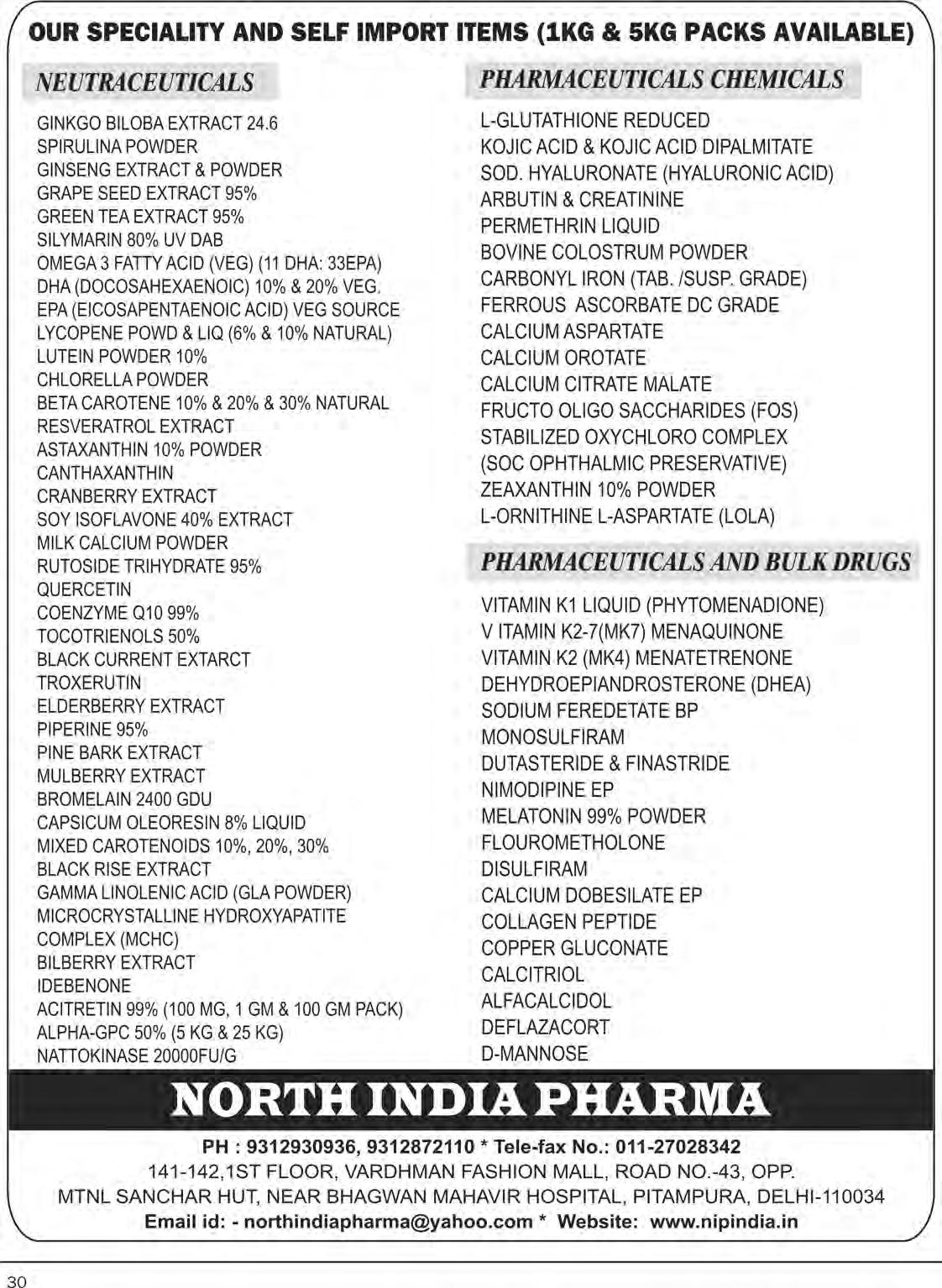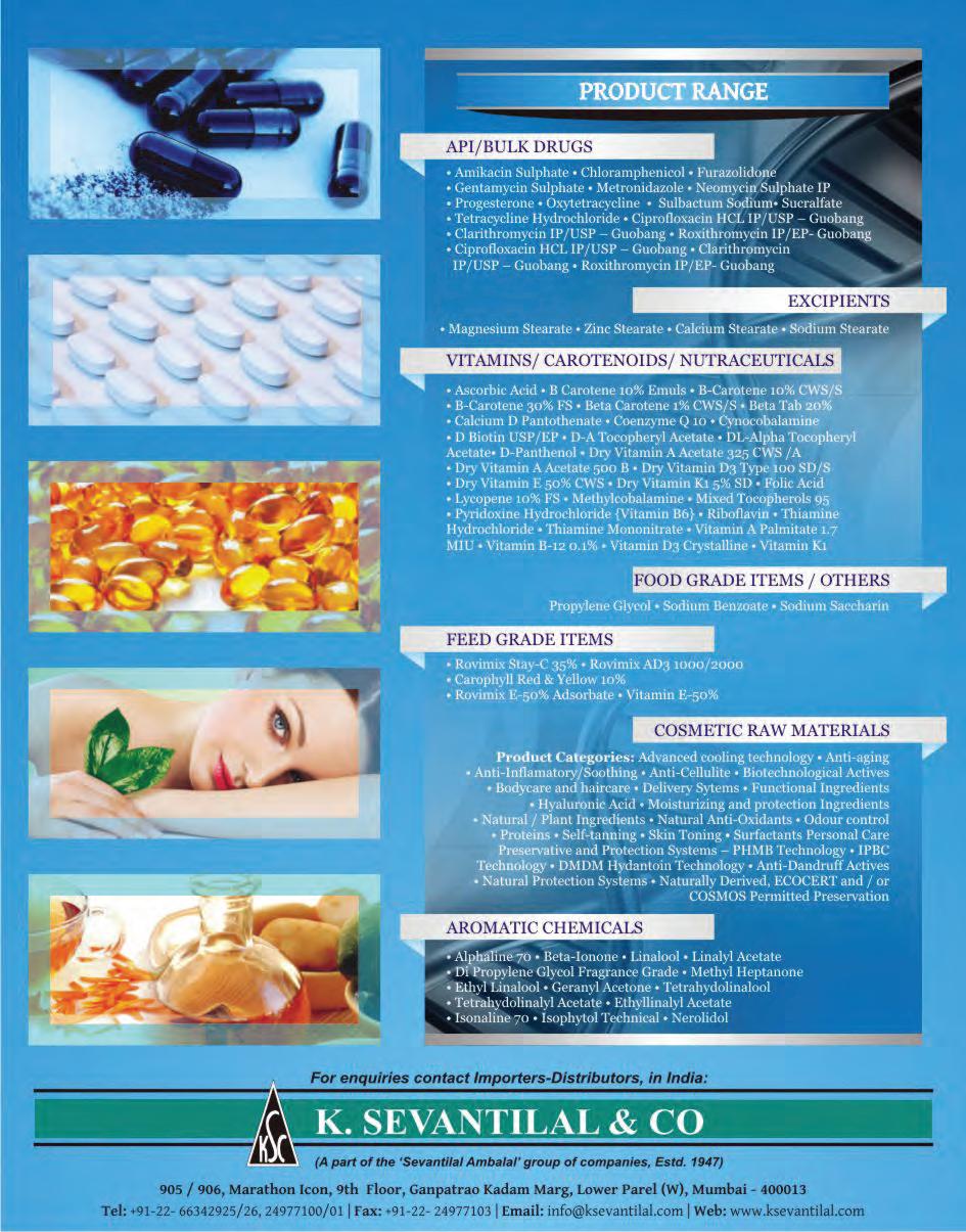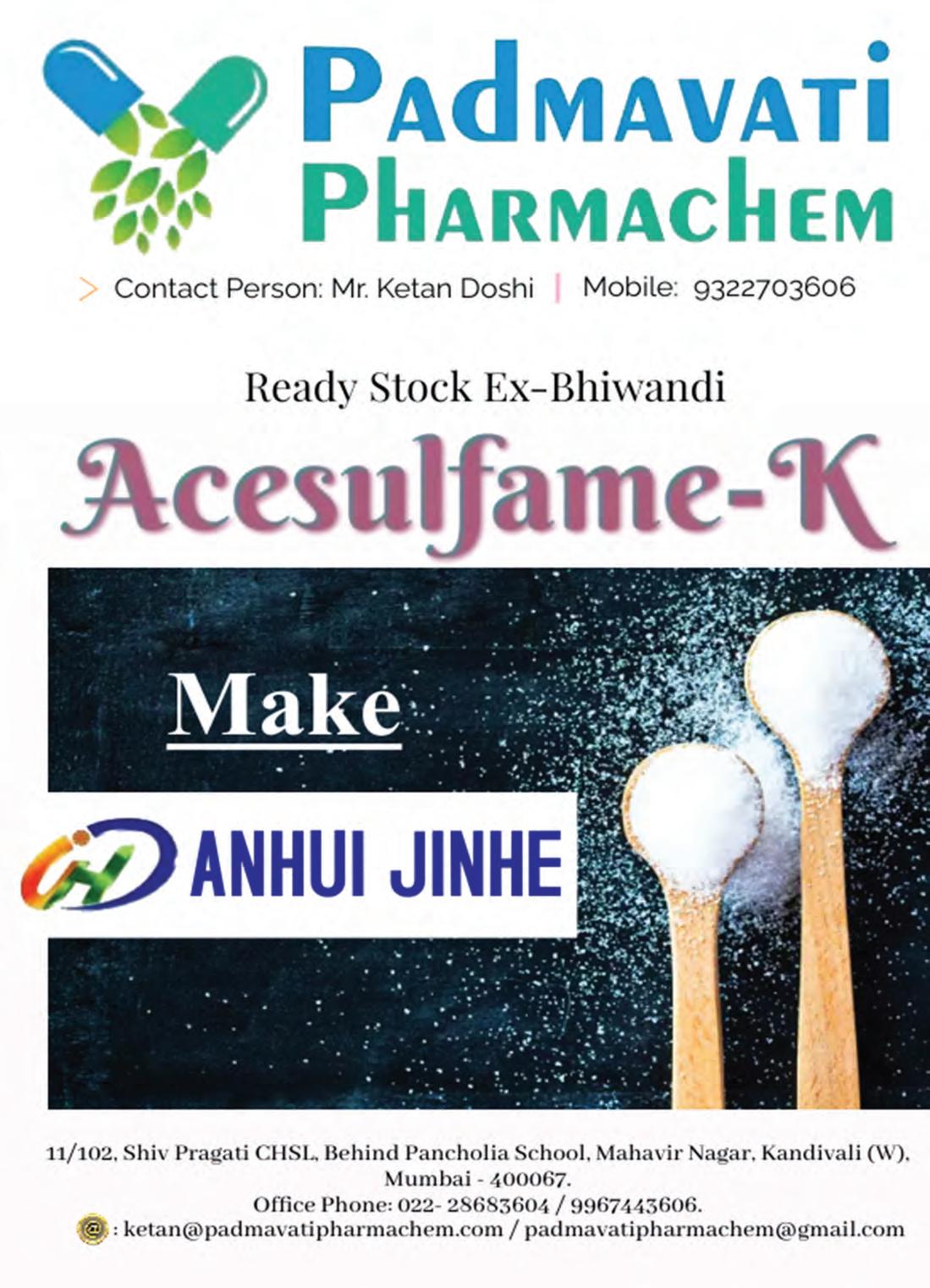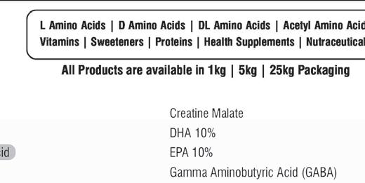 Acesulfame k FCCV 25kg Anhui Jinhe Alpha Lipoic Acid 25kg Tohope Ascorbic Acid (Vitamin C Plain) 25kg Shandong Luwei / CSPC Aspartame 20 / 60 / 100 / 300 25kg Sinosweet / G. Sweet Mesh / Granuler Azithromycin 25lg Dongfeng / Guobang Caffine Anhydrous 25kg Cspc Ciprofloxacin 25kg Aarti Cyanocobalamin (Vit B12) 100Gms/1Kg Kingvit / Hebei Huarong D-Calcium Pantothenate 20/25Kg BASF DL-Alpha Tocopherol 5Kg BASF Doxycycline Hcl 25 Kg Hebei Dongfeng DryVitamin A-Acetate 500 CWS 1Kg Piramal DryVitamin A-Acetate 325 CWS 25Kg BASF Dry Vitamin D3 100 GFP 25Kg BASF FOS L55 25Kg Tata Chemical FOS L55+ 25Kg Tata Chemical FOS L95 25Kg Tata Chemical FOS P95 20Kg Tata Chemical Griseofulvin 20Kg Inner Mongolia