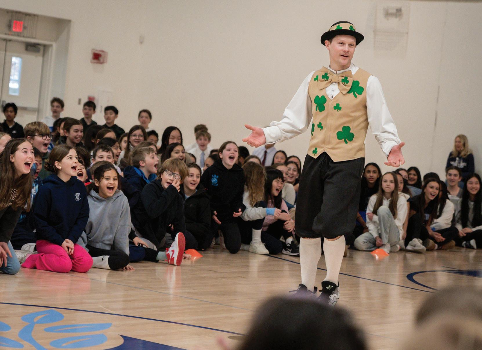 Starting nine hours before tipoff, the day kicked off with a highenergy pep rally back on campus. Sitting on the floor of the Vinik Family Center, students were in for a touch of Celtics magic as Lucky the Leprechaun, donning his trademark shamrock vest and hat, made a surprise appearance. Lucky and his assistant performed some of their signature moves—a spinning basketball routine, some high-flying trampoline acrobatics, and even a leaping dunk over Mr. grover! With every “ooh,” “aah,” and roar of applause in the gym, a buzz of excitement spread through the halls and carried straight into the evening’s games. Following the pep rally, the varsity basketball teams stayed behind for a special visit from Ariann Williams, a class of ’04 Meadowbrook alum who now works for the Boston Celtics. She spoke about her role in the organization and shared a highlight of her career—her 2024 NBA Championship ring.