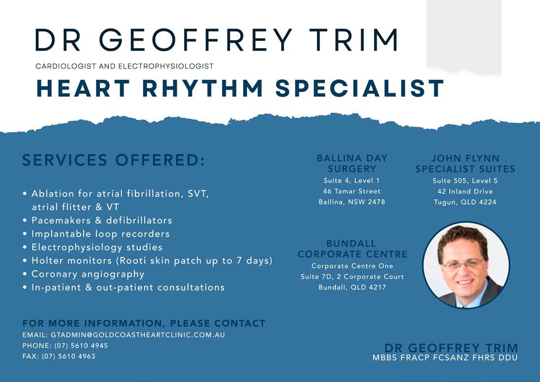 DISCLAIMER: The contents of articles and opinions published are not necessarily held by the publisher, editor or the Gold Coast Medical Association. No responsibility is accepted by the publisher, editor or Gold Coast Medical Association for the accuracy of information contained in any opinion, information, editorial or advertisement contained in this publication and readers should rely upon their own enquiries in making decisions touching own interest. Unless specifically stated, products and services advertised or otherwise appearing in The Medical Link are not endorsed by the publisher, editor or the Gold Coast Medical Association.