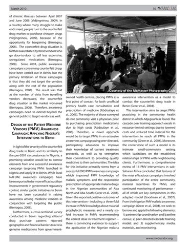 owned health centres, placing PMVs as a first point of contact for both unofficial primary health care consultation and prescription of medicine (Abdoulaye et al., 2006). The majority of those surveyed do not commonly visit a physician prior to purchasing prescription medications due to high costs (Abdoulaye et al., 2006). Therefore, a novel approach would be to target PMVs in an extensive awareness campaign using peer-directed, participatory education to improve their knowledge of current treatment protocols, as well as to strengthen their commitment to providing quality medicines to their communities. The idea for this initiative primarily stems from a successful 2003 PMV awareness campaign which improved PMV knowledge of malaria symptoms and the responsible prescription of appropriate malaria drugs in the Nigerian communities of Aba North and Aba South (Greer et al., 2004). Given the reported positive outcomes of this intervention - including a three-fold increase in PMV knowledge about malarial prophylactic measures and a nearly sixfold increase in PMVs recommending the correct dose in treatment regimen – there is convincing evidence to support the application of the Nigerian malaria