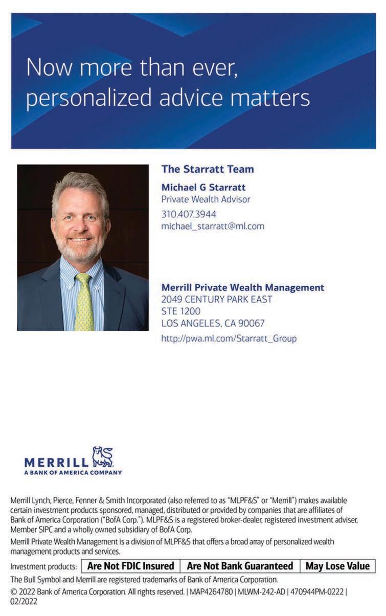 DIRECTORY 32 ACCOUNTANT Blaise E Abergel ....................... 31 ALTERNATIVE WELLNESS Cookies Brentwood .................... 61 AMPLIFIERS & PEDALS L.A. Vintage Gear ....................... 9 BIKES Helens Cycles .......................... 29 COSMETIC DERMATOLOGY Beauty Religion ........... Front Inside Cover COVID TESTING Testing Hollywood ..................... 27 FAMILY LAW Law Offices of Vicki J Greene ........... 11 FINANCIAL ADVISORS The Starratt Team ...................... 21 FOOD TRUCK CATERING The Lime Truck ......................... 17 GUITARS L.A. Vintage Gear ....................... 9 HOTEL Luxe Sunset Blvd Hotel ................ 29 ICONIC JEWELLERY Asprey................................... 7 LEATHER Asprey................................... 7 LUXURY RESIDENCES Villa Bel Air .............................. 5 PAINTING SERVICES Clif Jones Painting Company ... Back Cover PILATES Shauna Michele Pilates ................. 9 REAL ESTATE The Joyce Rey Team ................... 13 Susan Kastner Homes ................. 31 REALTOR Michaela Cadiz Inc . . . . . . . . . . . . . . . . . . . . . . 3 Neyshia Go ............................. 23 RESTAURANT Blue Plate Restaurant Group .......... 19 SILVER GIFTS Asprey................................... 7 TRAVEL CHANNEL Go Traveler ............................. 15 WOOD REFINISHING Finishes Pro ..............................1